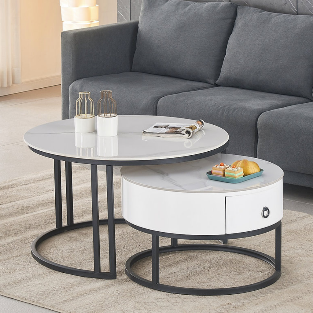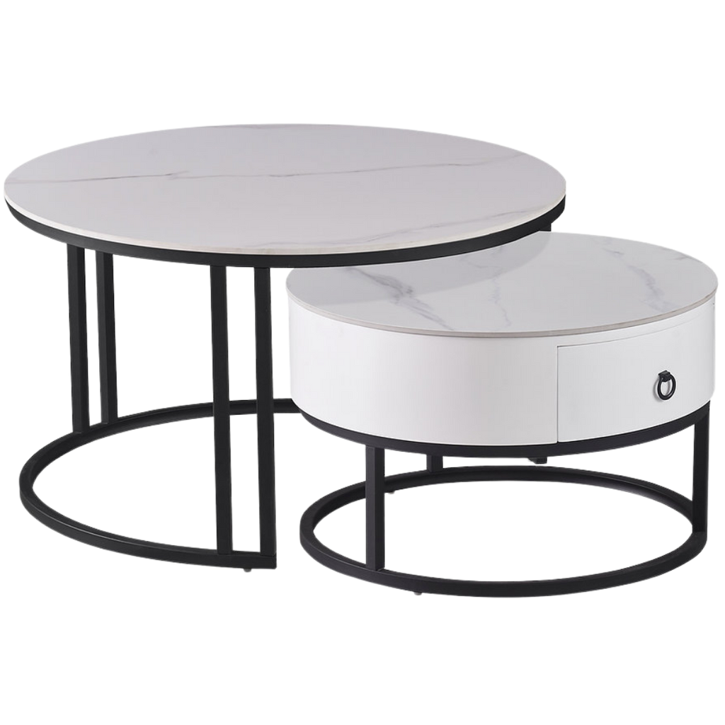A 2-piece round coffee table set featuring white sintered stone marble-look tops and a black steel base, designed to offer a refined centerpiece with added storage functionality.