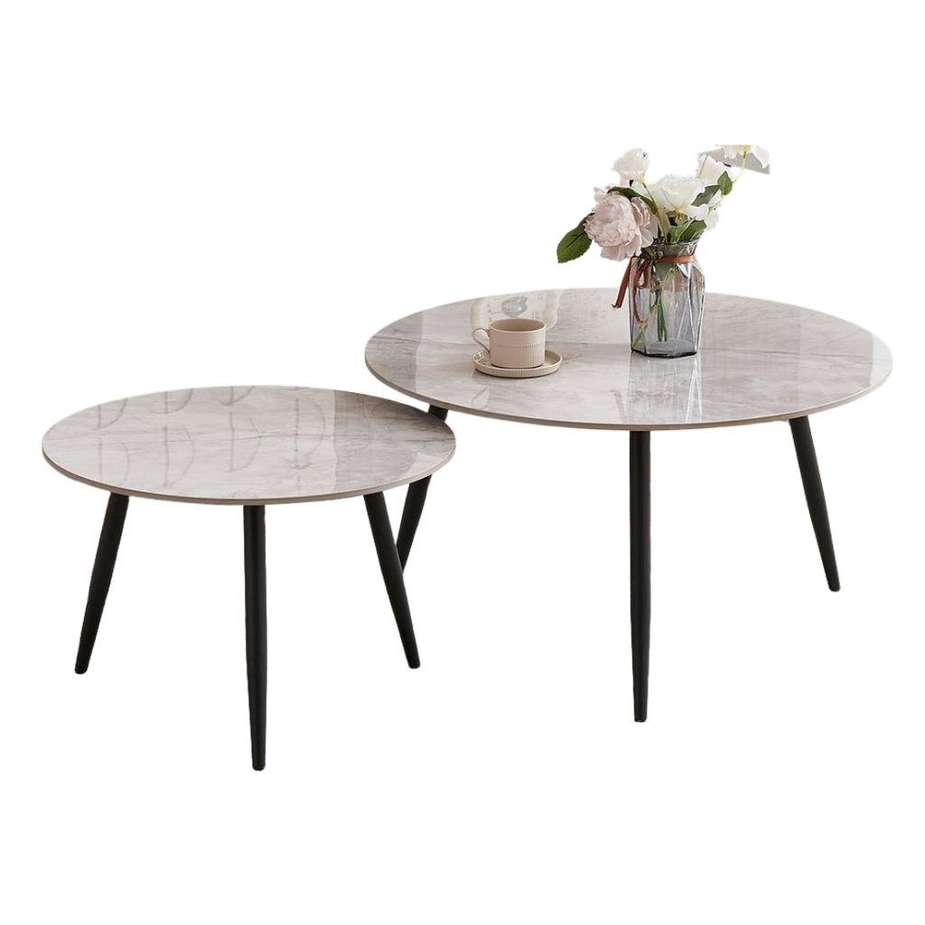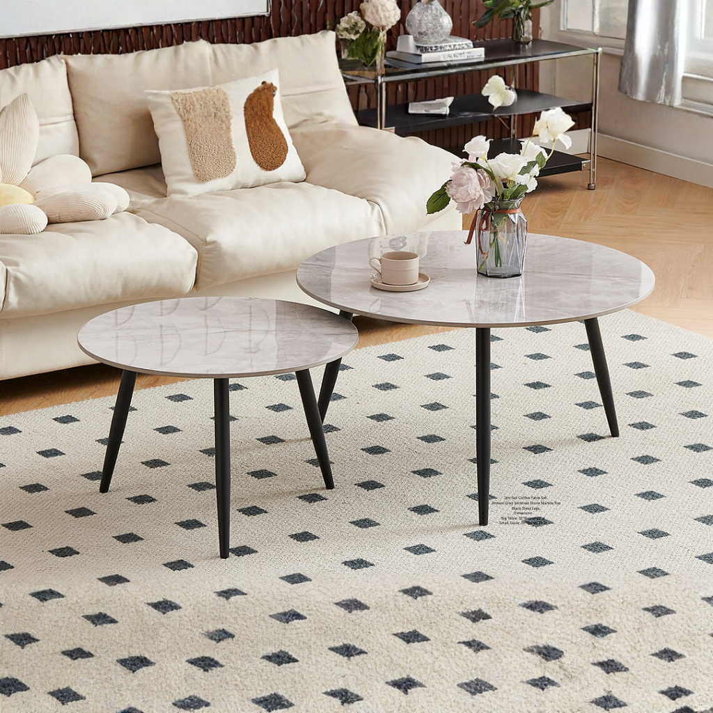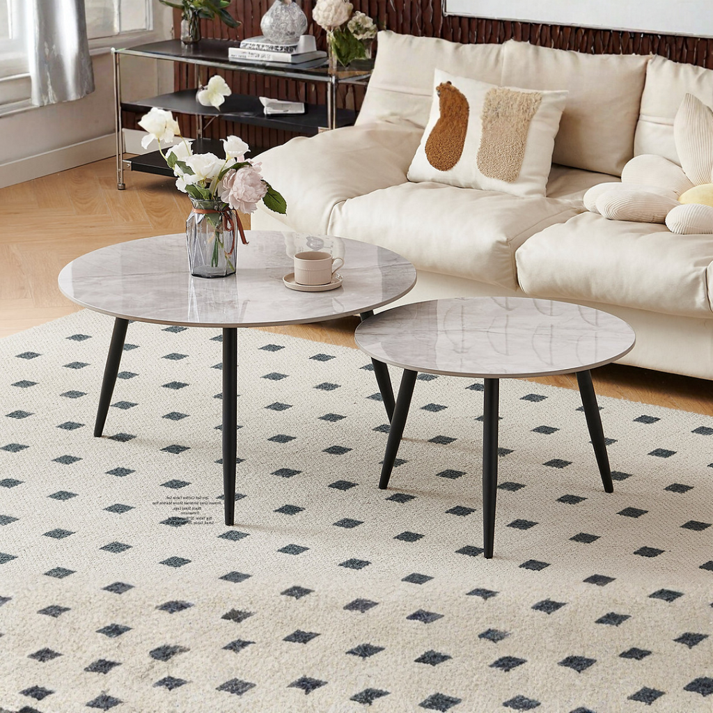 The Denra coffee table set pairs elegant Armani Grey sintered stone tops with slim black steel legs, offering a clean marble-look finish and reliable durability. The heat-resistant and scratch-resistant surfaces support everyday use, while the tapered steel legs provide stability with a lightweight visual profile. The two tables can be nested for a layered display or used separately to adapt to various room layouts. Denra combines practicality with refined style, making it a strong addition to modern living spaces.