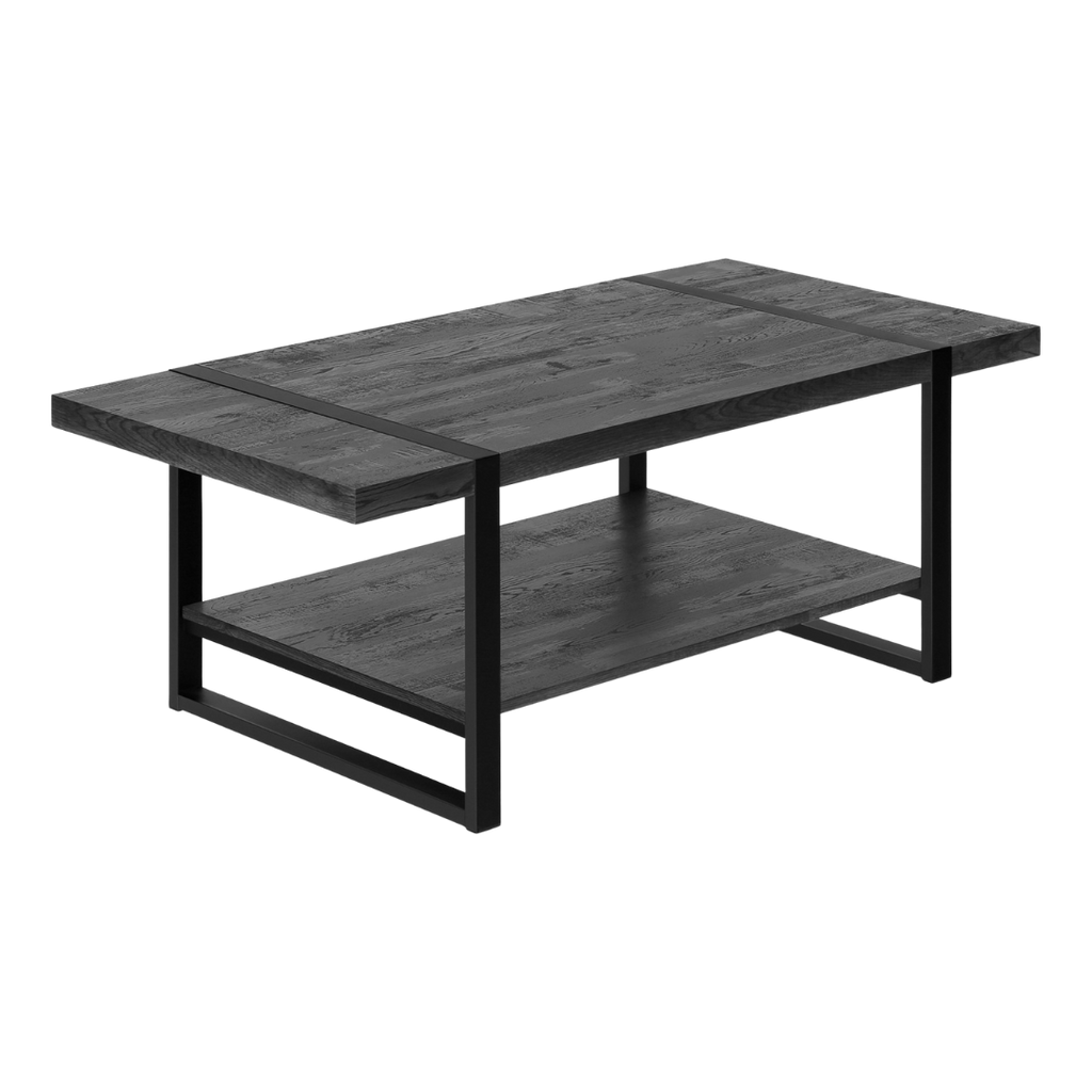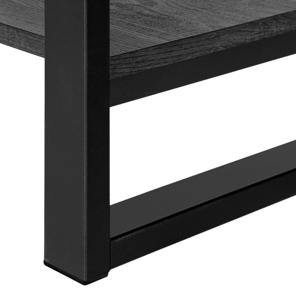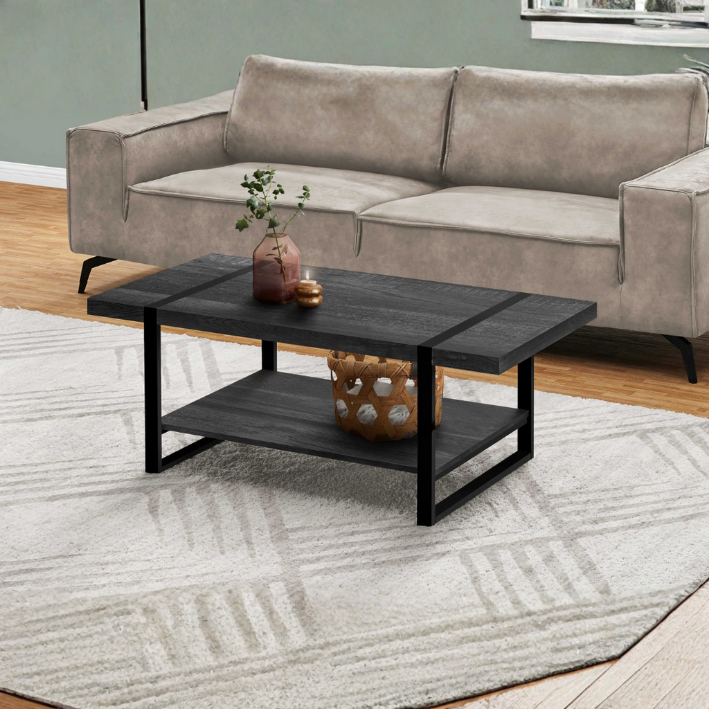 The Dona coffee table in black combines a reclaimed-wood–look finish with a strong black metal base, achieving a balanced industrial farmhouse aesthetic. The thick tabletop and matching lower shelf provide generous space for storing and displaying items, while the metal legs extend through the surface for visual contrast and increased stability. With its dark wood-look tone and clean structural lines, Dona brings rustic charm and urban style to modern living rooms.