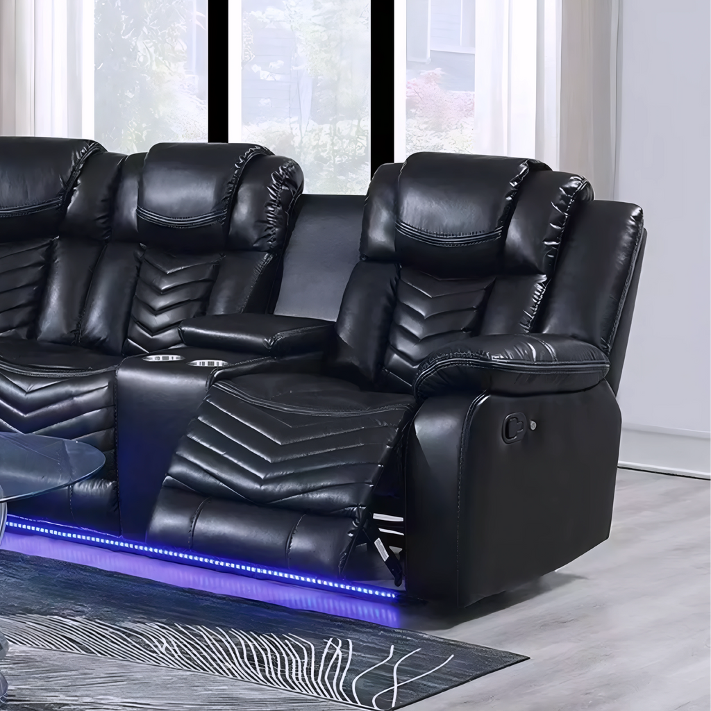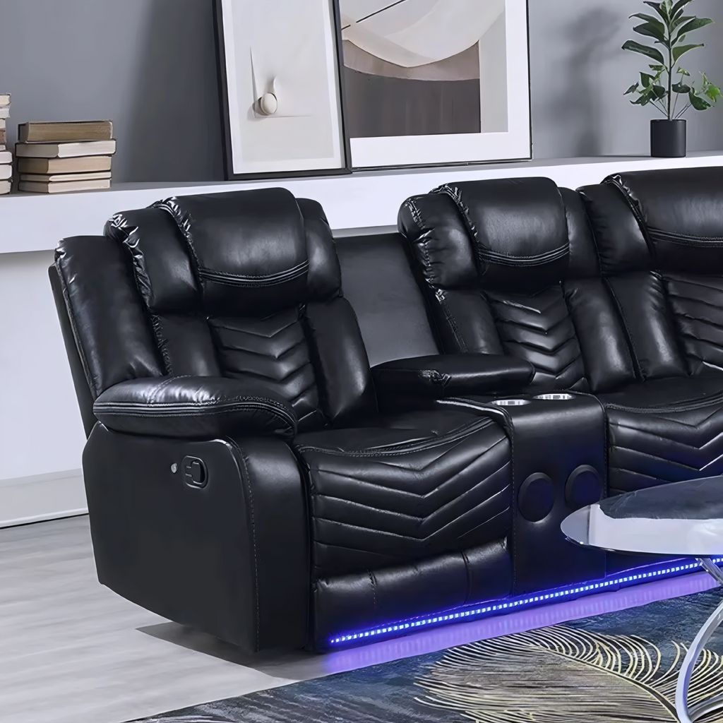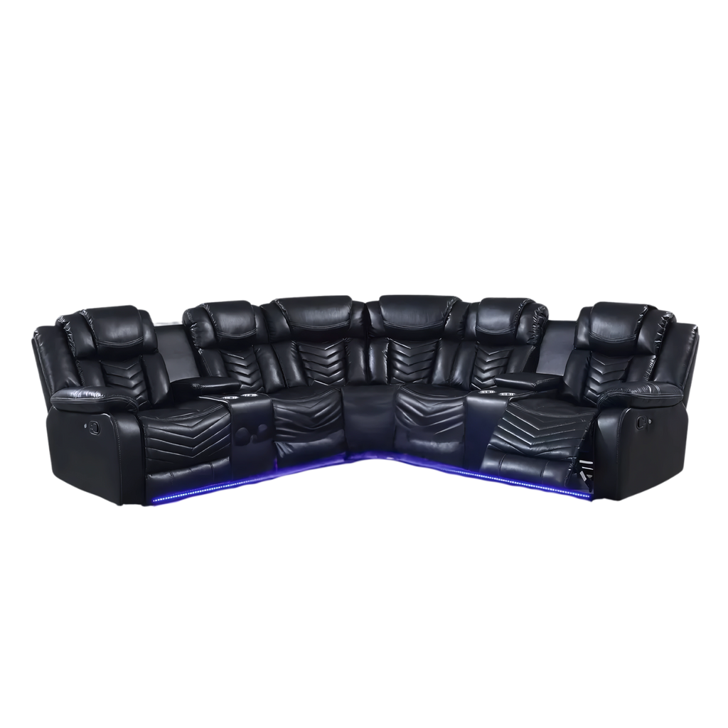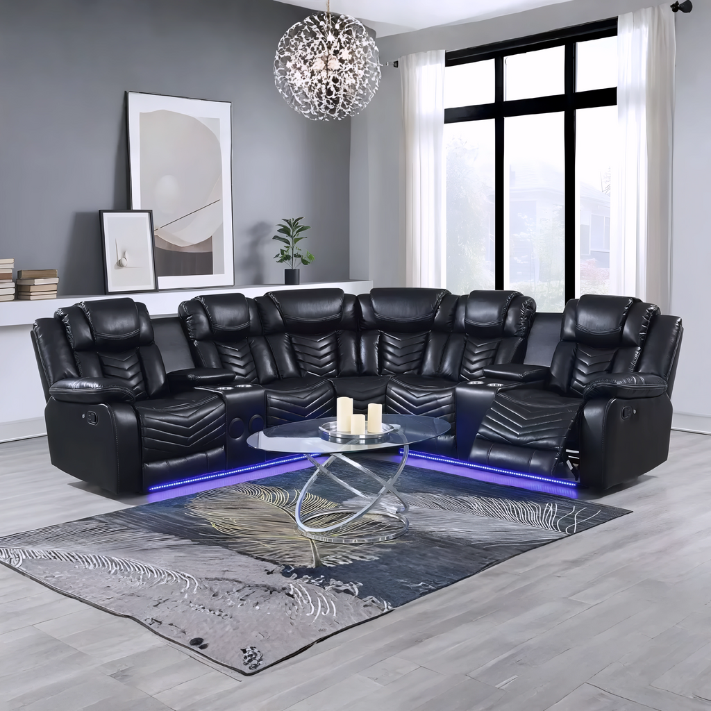 A premium black air-leather power-reclining sectional built for comfort, technology, and flexibility. This reversible 115" x 115" x 40" layout includes dual reclining ends, deep-cushioned seating, LED ambient lighting, and multiple storage and cupholder zones. Designed for large living rooms, it offers a high-impact modern look with maximum lounging performance.