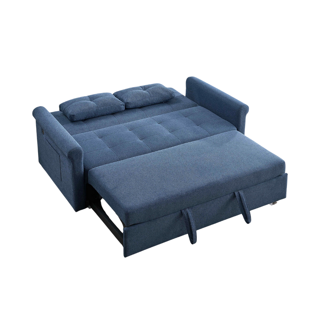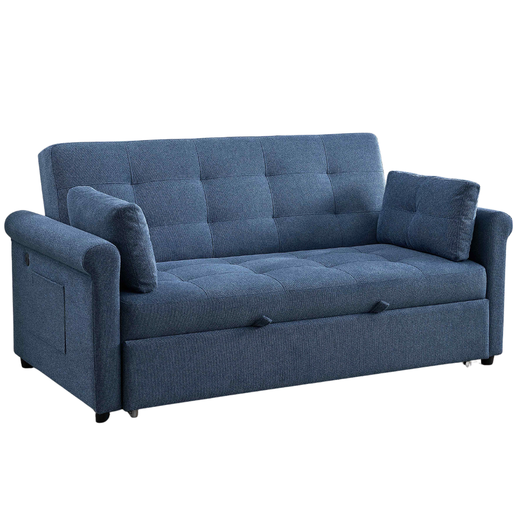 A compact adjustable-back sofa bed featuring soft-touch slate-blue upholstery, built-in charging ports, and a smooth fold-flat mechanism ideal for condos and multifunctional spaces.