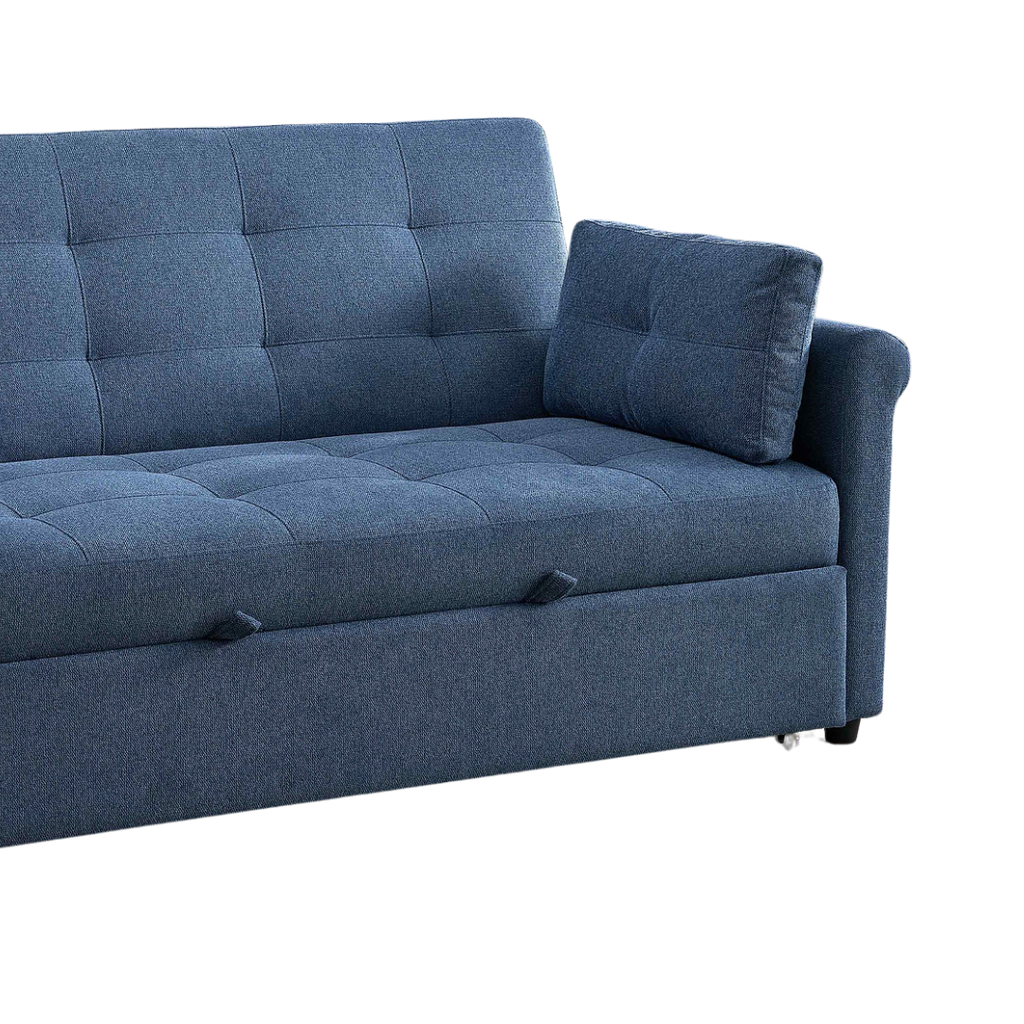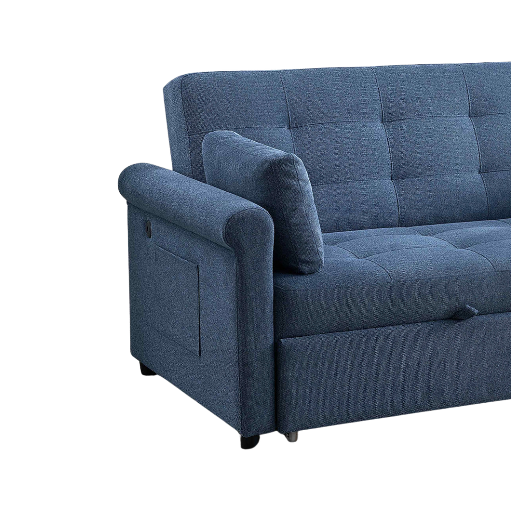 The Loriva sofa bed blends compact design with multi-functional performance. Its adjustable backrest offers three positions—including a fully flat bed—allowing smooth transitions between lounging, sitting, and sleeping. Soft-touch slate-blue upholstery elevates comfort and visual appeal, while built-in USB and USB-C ports keep devices powered within reach.