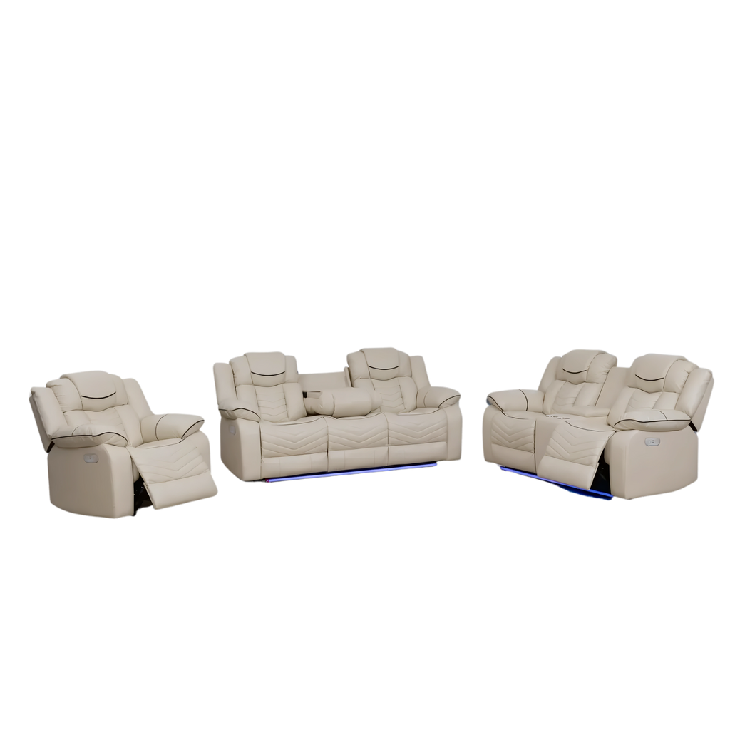A modern beige air-leather recliner set designed for maximum comfort and everyday durability. The Aylem collection includes a sofa, loveseat, and chair—each equipped with plush cushioning, supportive seating, and smooth reclining functionality. Perfect for family living, home theatres, or anyone seeking a soft, inviting, and low-maintenance seating solution.