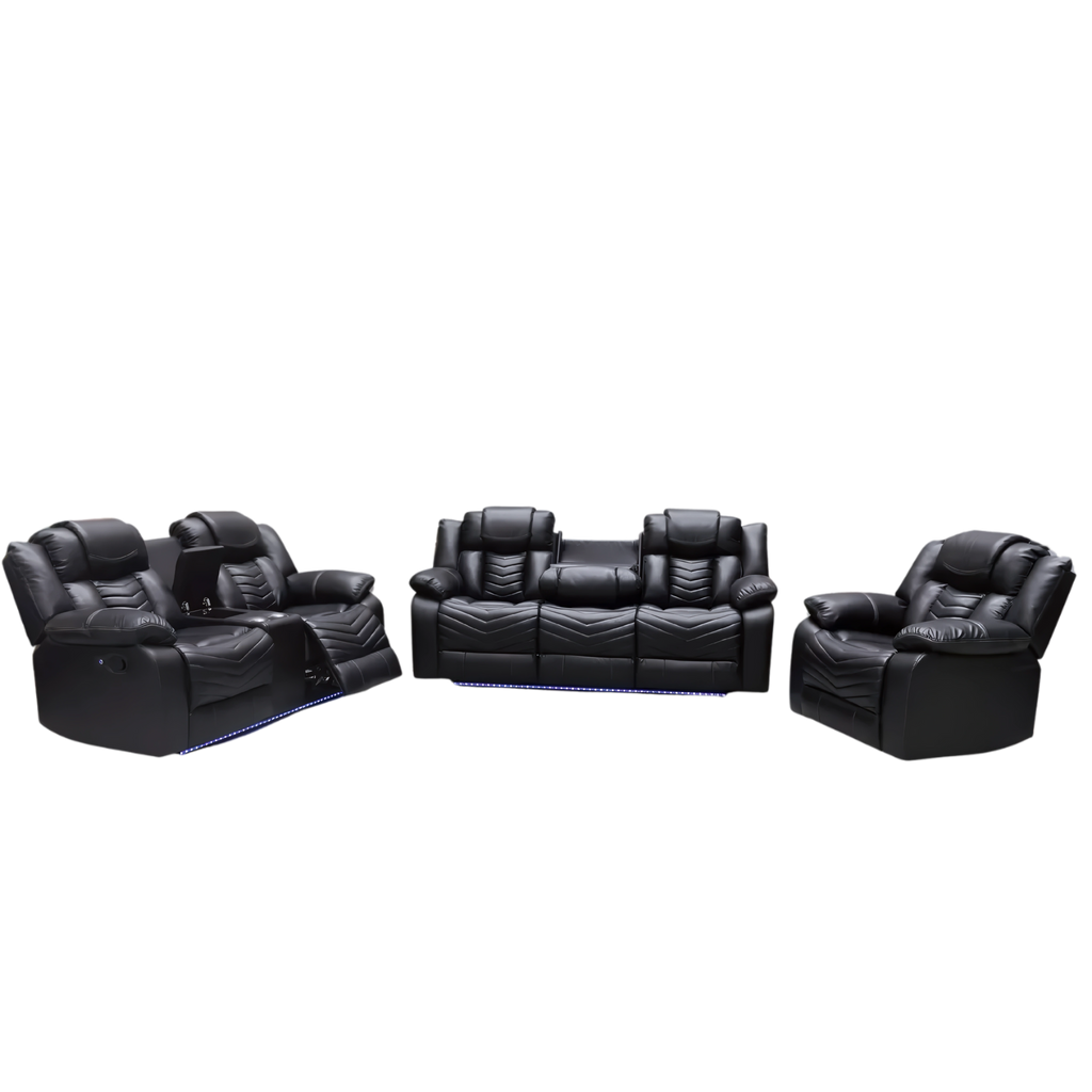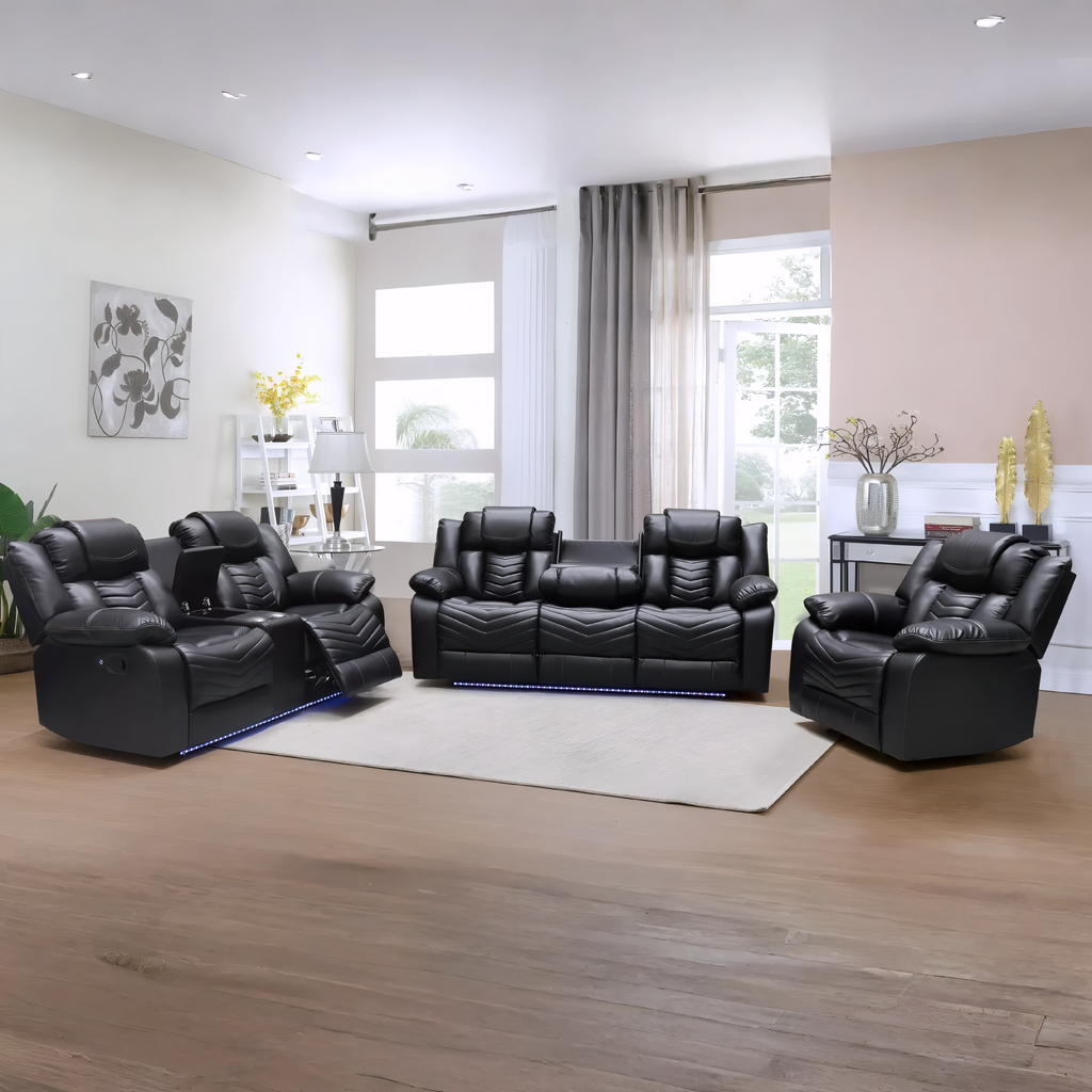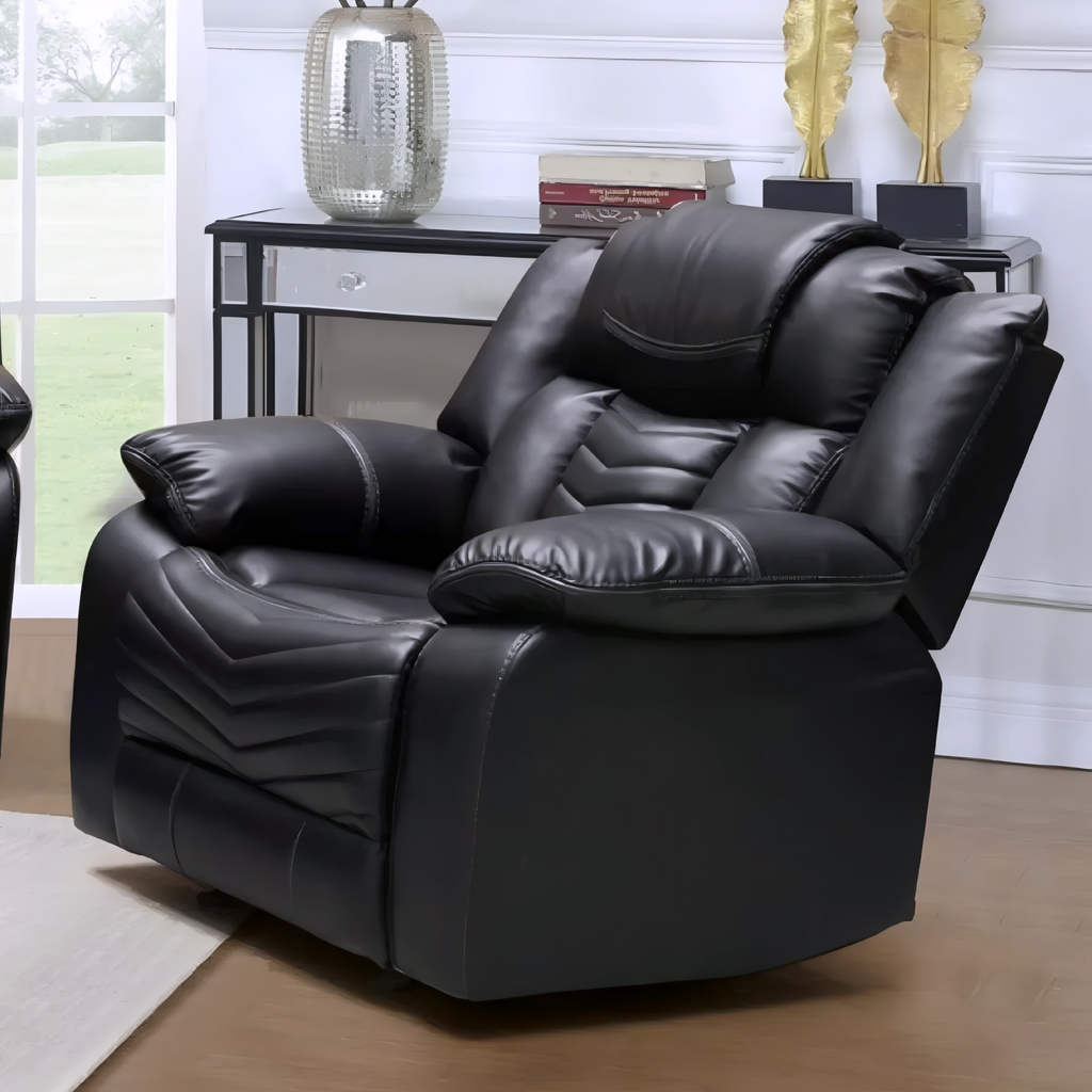 A black air-leather recliner set engineered for comfort, durability, and everyday family living. The Aylen collection includes a manual-reclining sofa, loveseat, and chair, each offering supportive cushioning, a modern quilted design, and smooth reclining motion. Ideal for medium to large living rooms seeking a dependable, stylish, and affordable reclining solution.