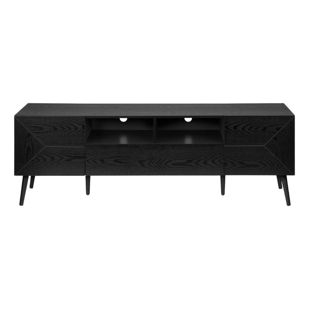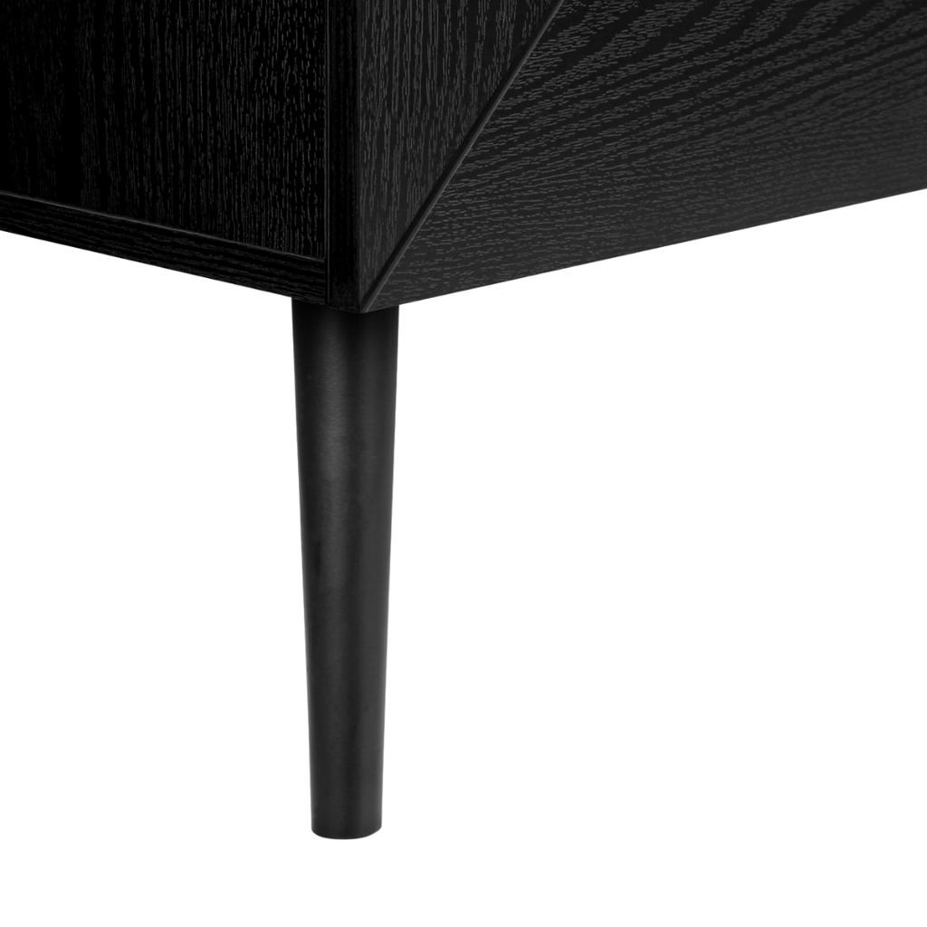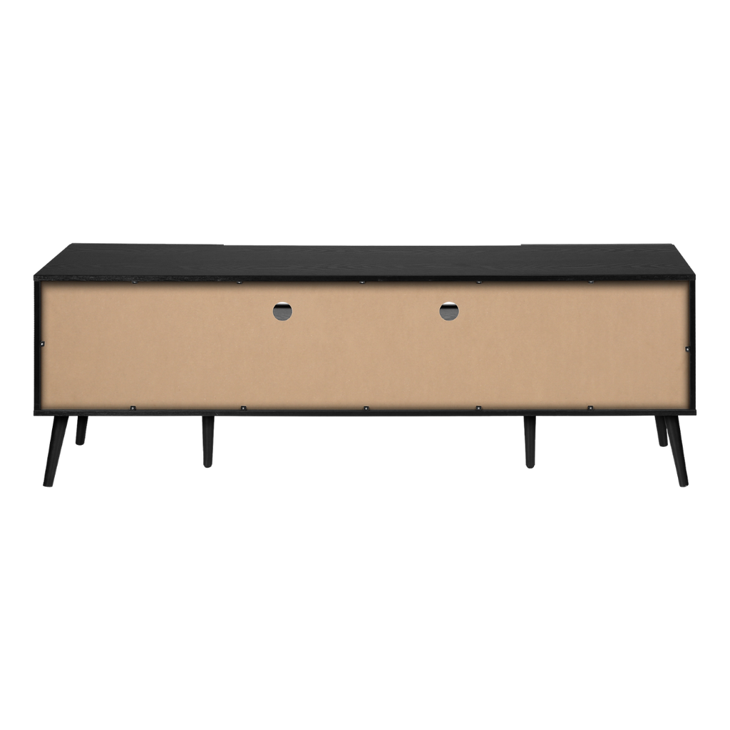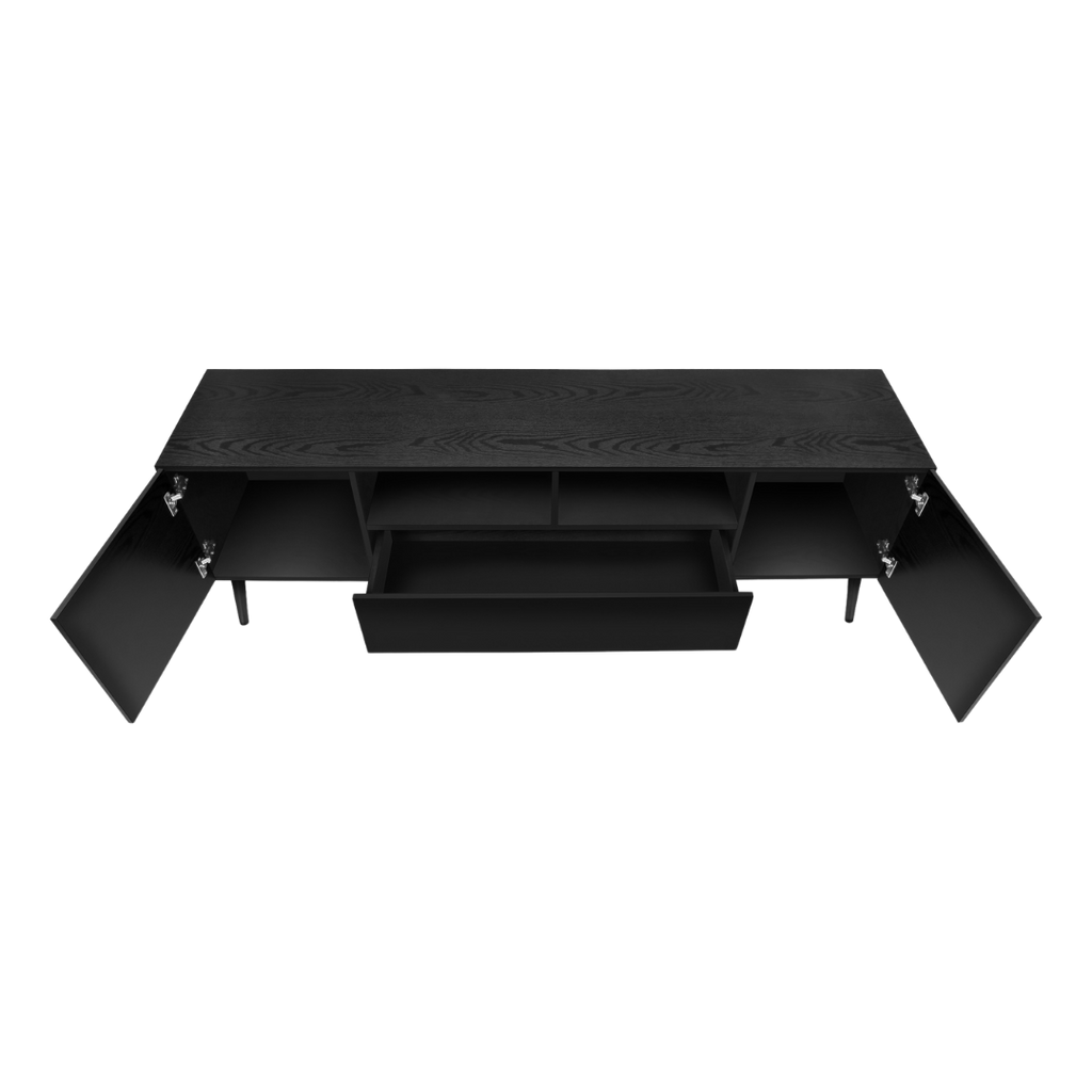 This black version of the Bay TV stand delivers a sophisticated mid-century aesthetic with modern practicality. The two open cubbies provide quick access to consoles and décor, while the central full-width drawer offers smooth, discreet storage for remotes and media accessories. On each side, the two closed cabinets feature stylish grooved fronts that enhance the retro-modern look while keeping clutter out of sight.