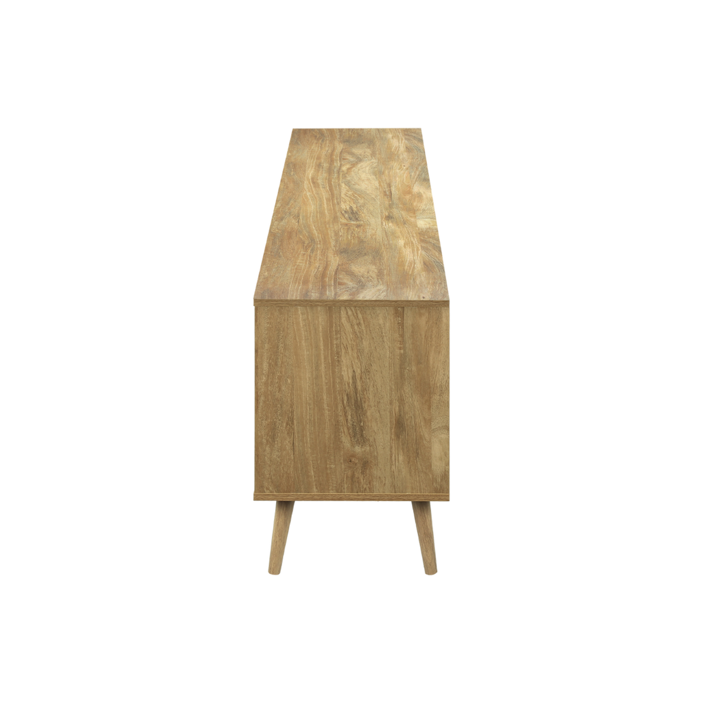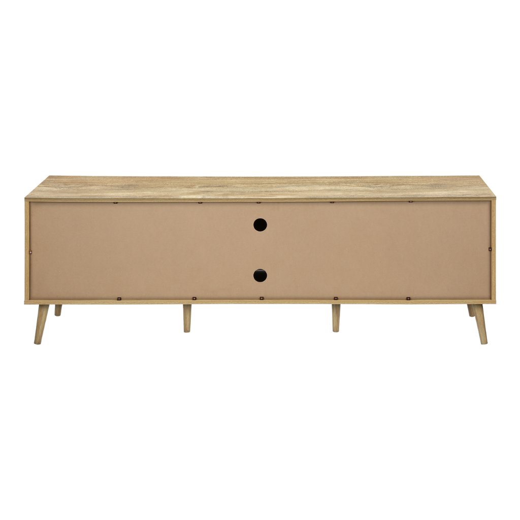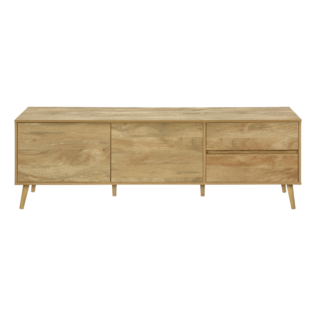 The Belvir TV stand delivers a refined mid-century aesthetic with practical storage. Its clean lines, smooth push-latch doors, and elevated solid wood legs create a stylish focal point for any living room. Two drawers and two cabinet compartments keep accessories organized, while the wide top surface supports large TVs. Cable-management openings maintain a tidy setup, and the walnut finish adds warmth to your décor.