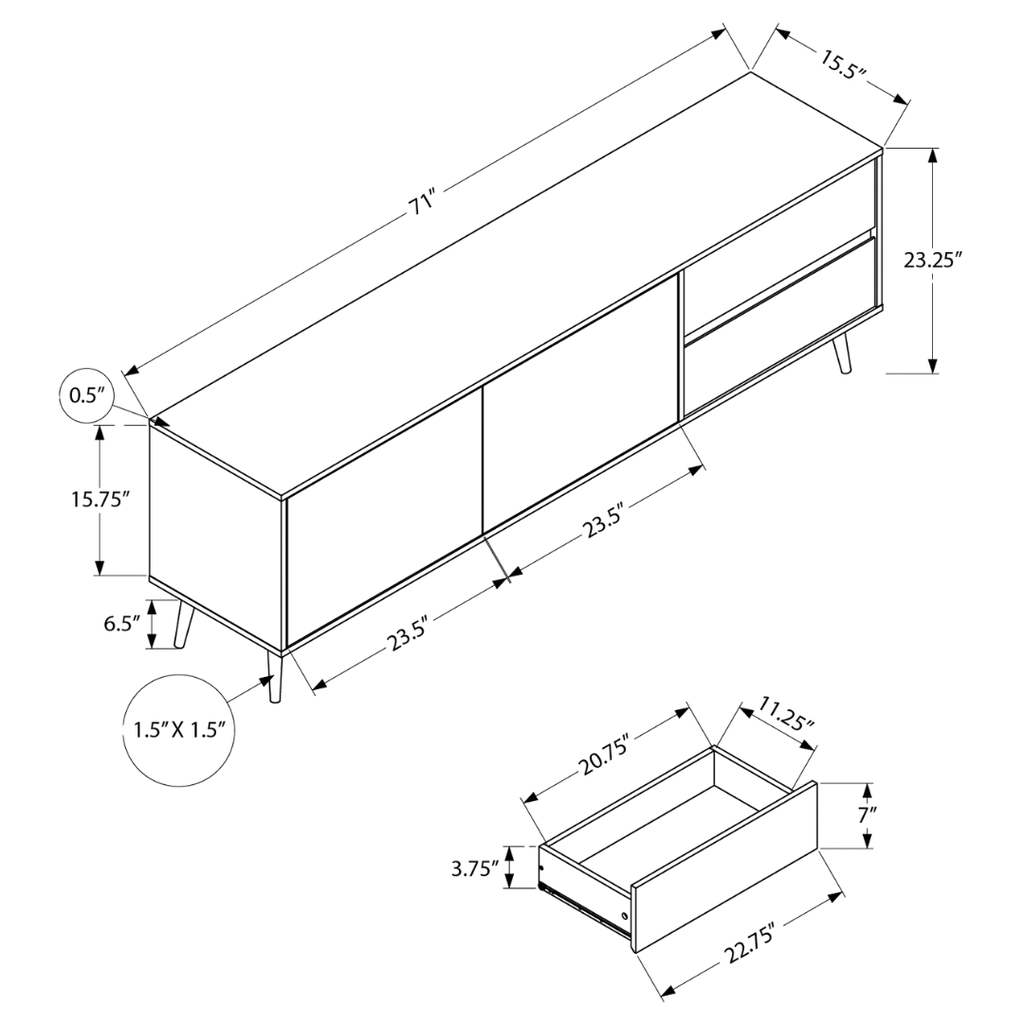 A 72-inch walnut TV stand with a clean mid-century silhouette, two storage drawers, and two cabinets with adjustable shelves. Designed for modern living spaces that need discreet storage and a warm wood-look finish.
