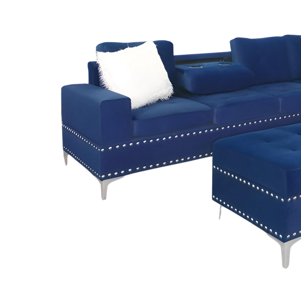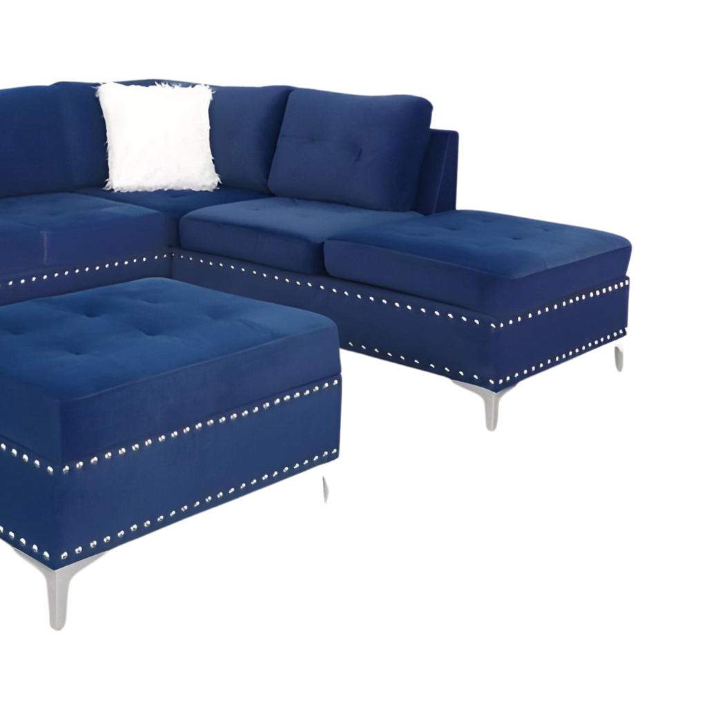 The Brano sectional brings together modern design, comfort and functionality. Its reversible chaise allows you to switch the configuration effortlessly, making it a versatile choice for open living spaces and contemporary homes. The premium velvet upholstery adds richness and depth, while the studded trim detail enhances its elegant silhouette.