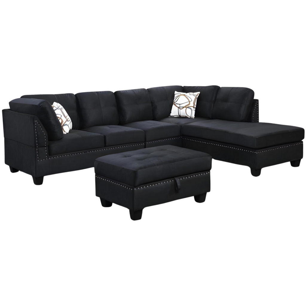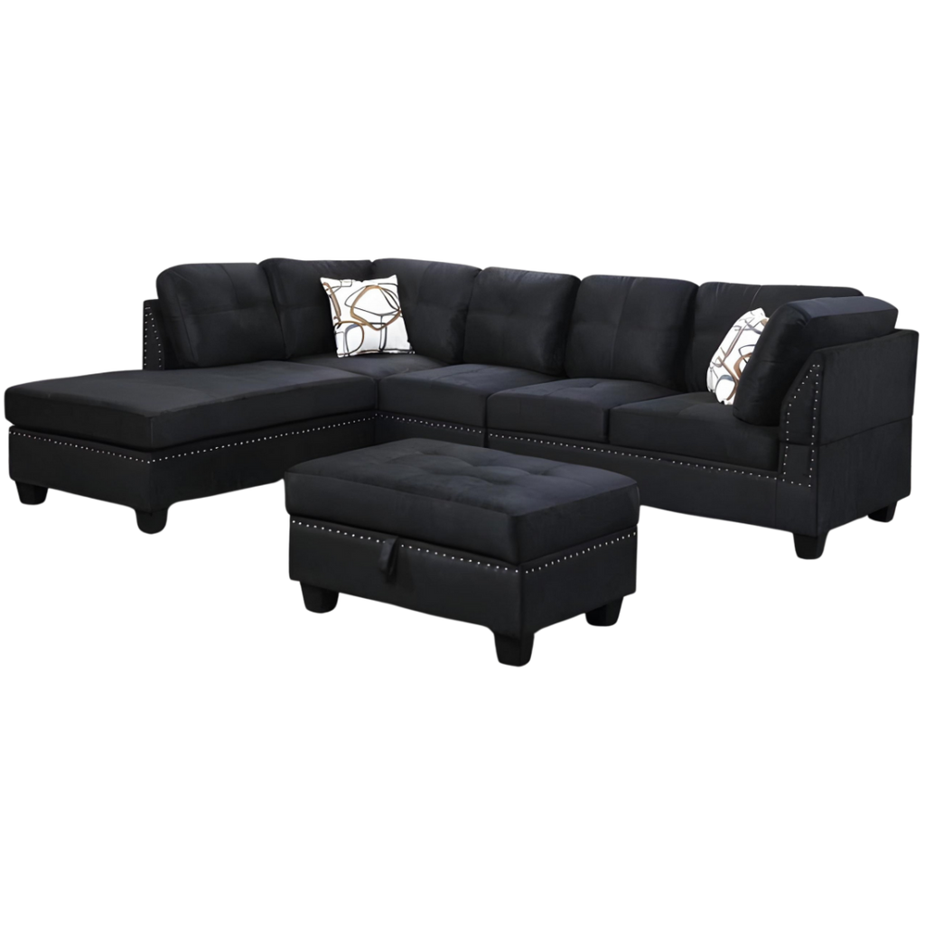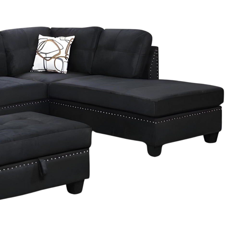 The Caldo sectional in Black Suede brings together comfort, style and generous seating capacity. With its reversible chaise, you can configure the layout to perfectly match your living space. The soft suede upholstery adds warmth and texture, while the nailhead detailing along the arms and base enhances its modern, elevated look.
