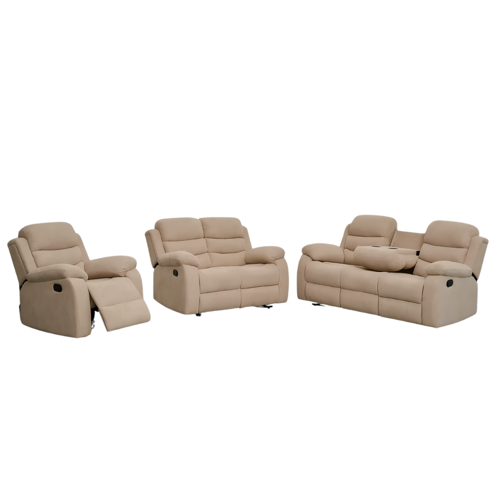 A soft-touch beige fabric recliner set built for everyday comfort and relaxed family living. This 3-piece manual recliner collection includes a plush sofa, loveseat with a center console, and a generously padded recliner chair. Designed with deep seating, pillowy armrests, and smooth manual reclining, Casa delivers a warm, cozy, and functional seating experience for any living space.