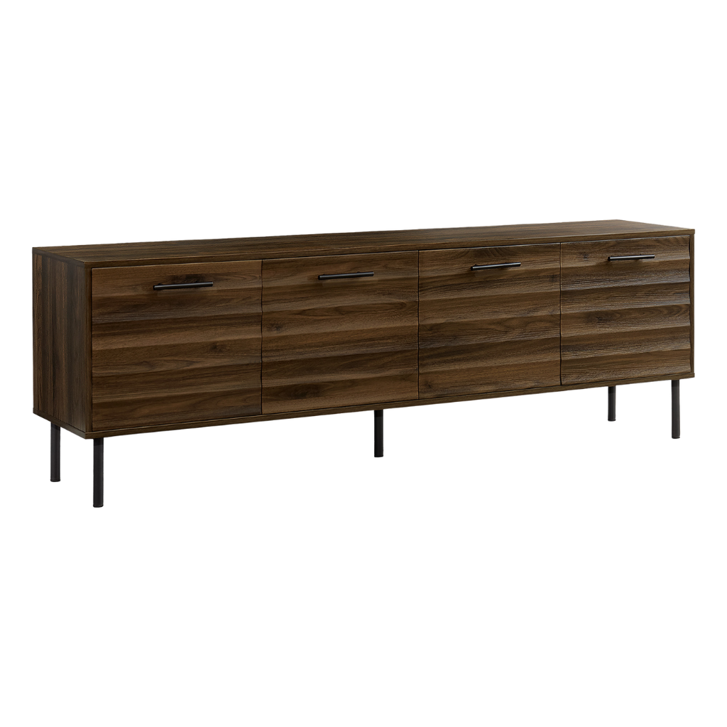 A transitional 72" dark brown wood-look TV stand featuring a rippled door design, full closed storage, adjustable shelves, and a sturdy black metal base. Danor blends mid-century inspiration with modern practicality for a clean and elevated entertainment setup.