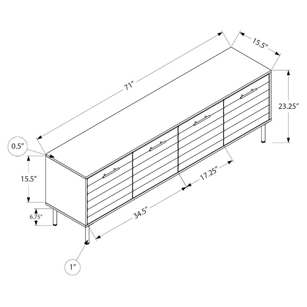 This dark brown version of the Danor TV stand brings a warm, mid-century influence with its ripple-front doors and clean modern form. Behind the four doors are two spacious cabinets, each with an adjustable shelf to organize electronics, games, or accessories. The black metal legs provide stability and lift the unit for an airy look, while the four cable-management holes keep wiring organized. Designed for larger spaces, Danor offers premium style and practical closed storage. Assembly is simple with illustrated instructions.