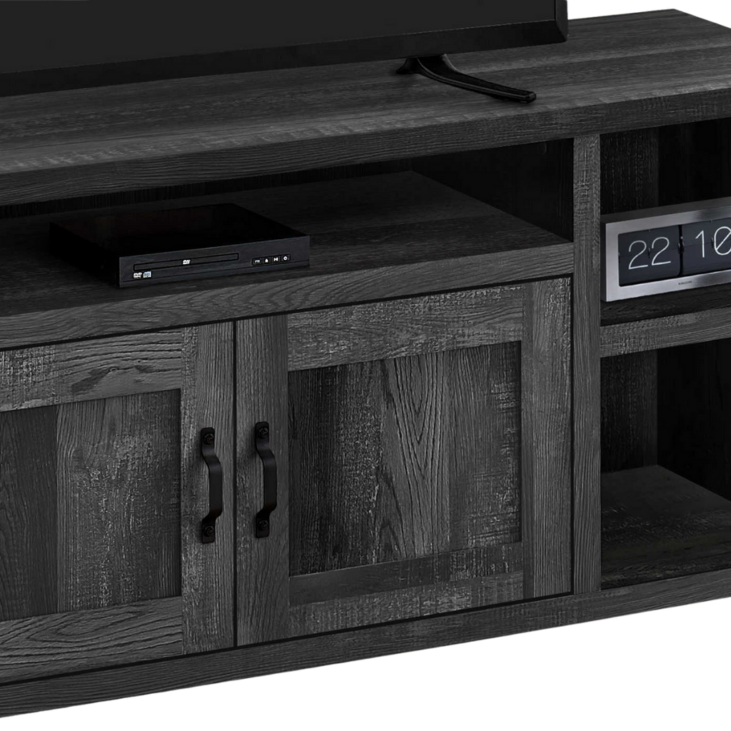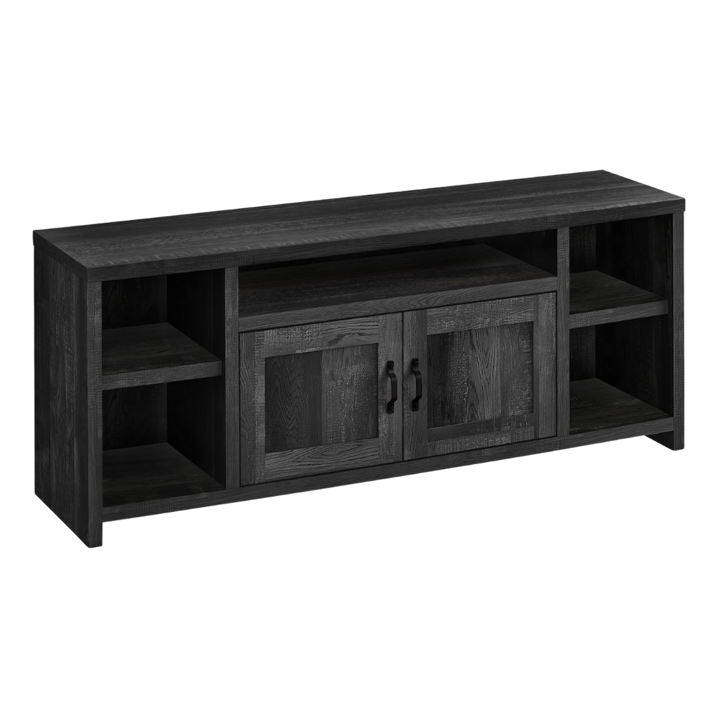A 60" modern farmhouse TV stand featuring a bold black reclaimed-wood look. Designed with 5 open shelves, 2 concealed storage areas, adjustable side shelving, and smart cable-management, Daven brings rustic charm and functional organization to any living space.