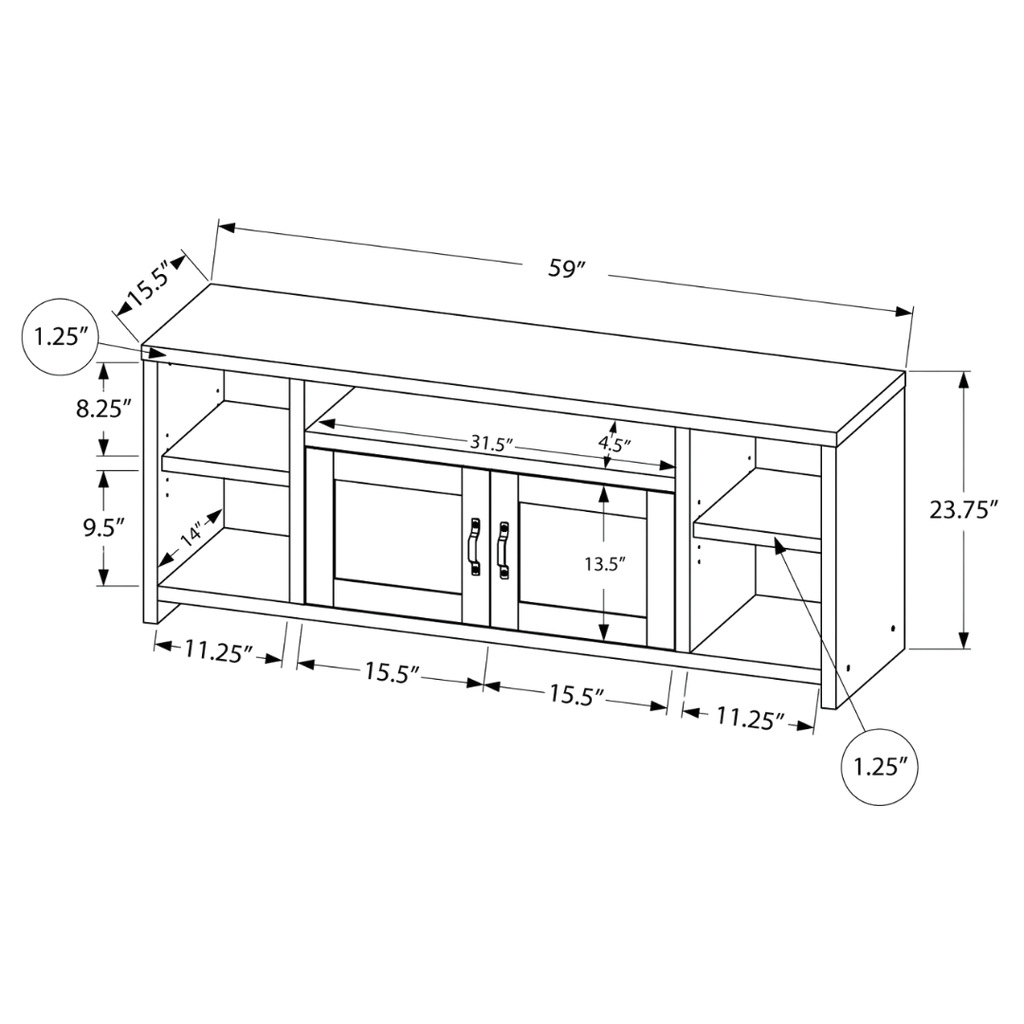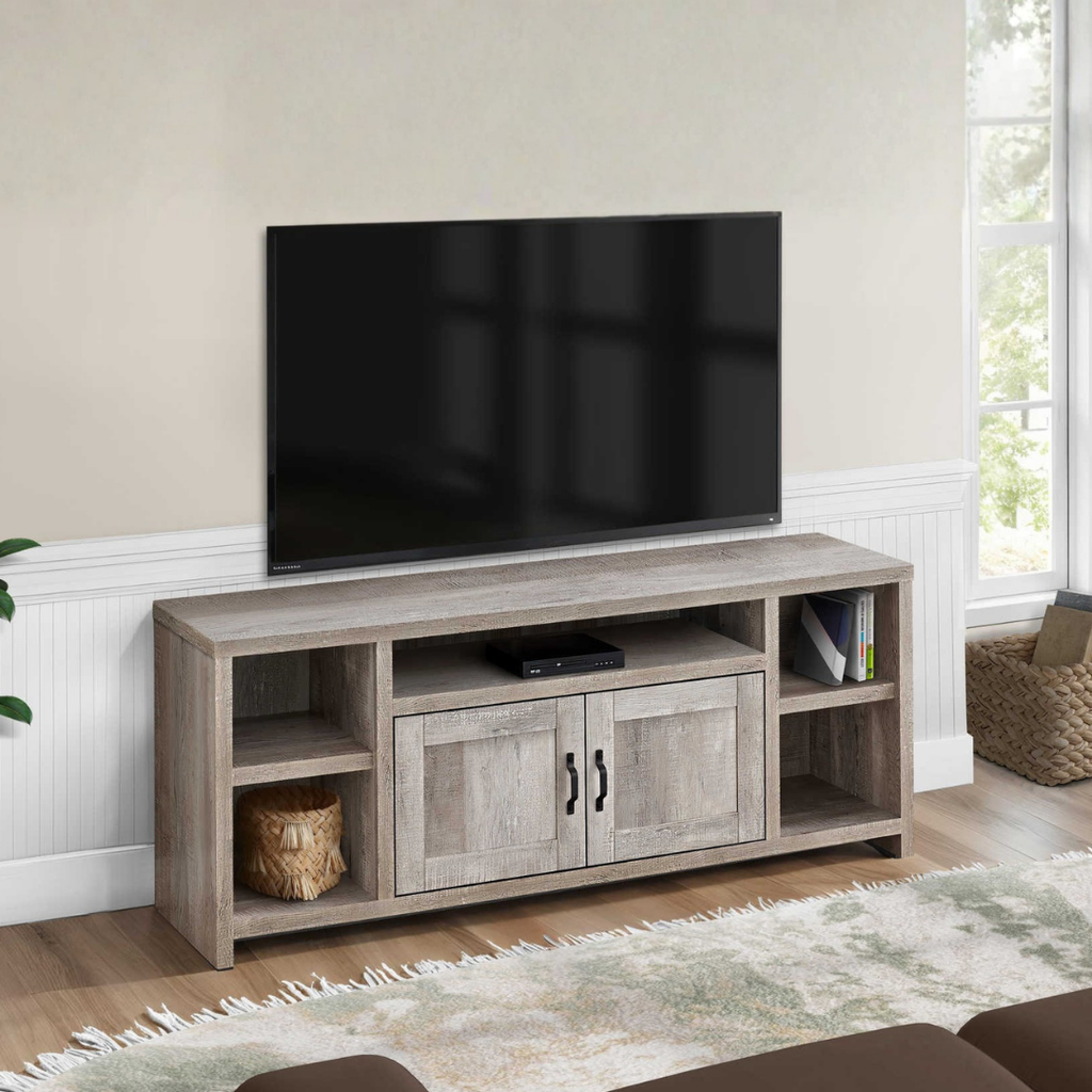 A 60" modern farmhouse TV stand in a warm taupe reclaimed-wood finish. Designed for functional storage with 5 shelves, adjustable side compartments, and dual-door concealed storage, Daven enhances contemporary and rustic interiors alike.