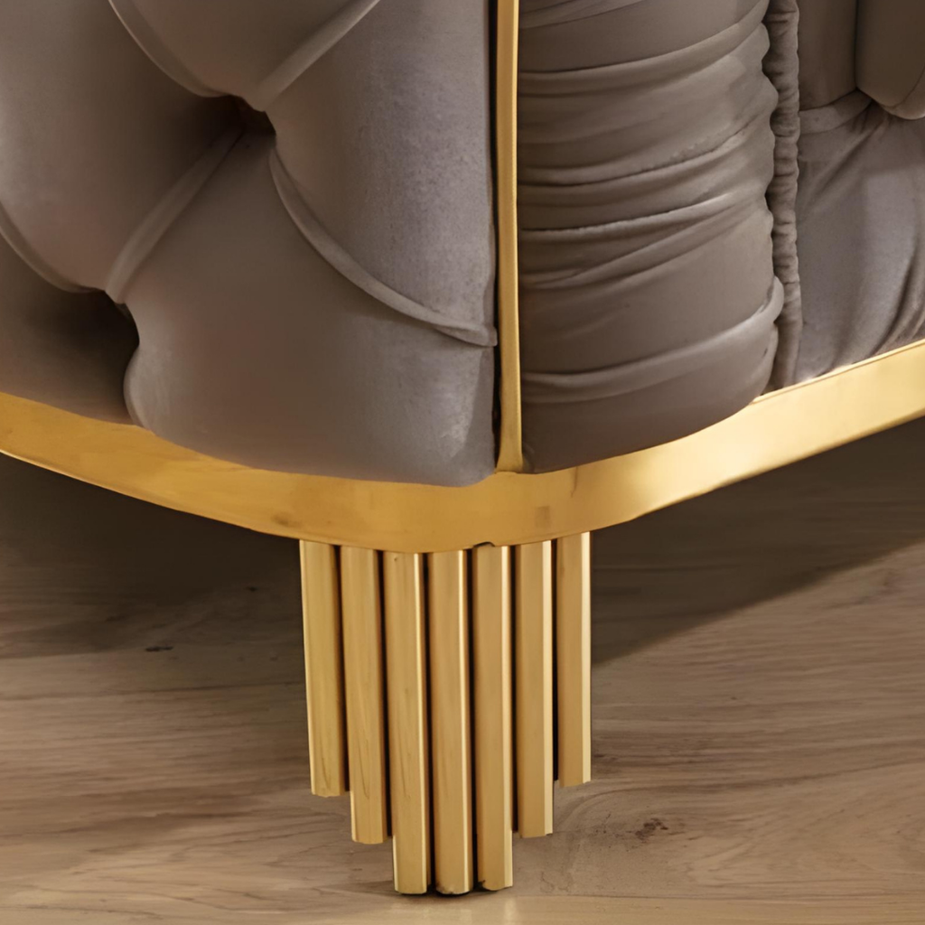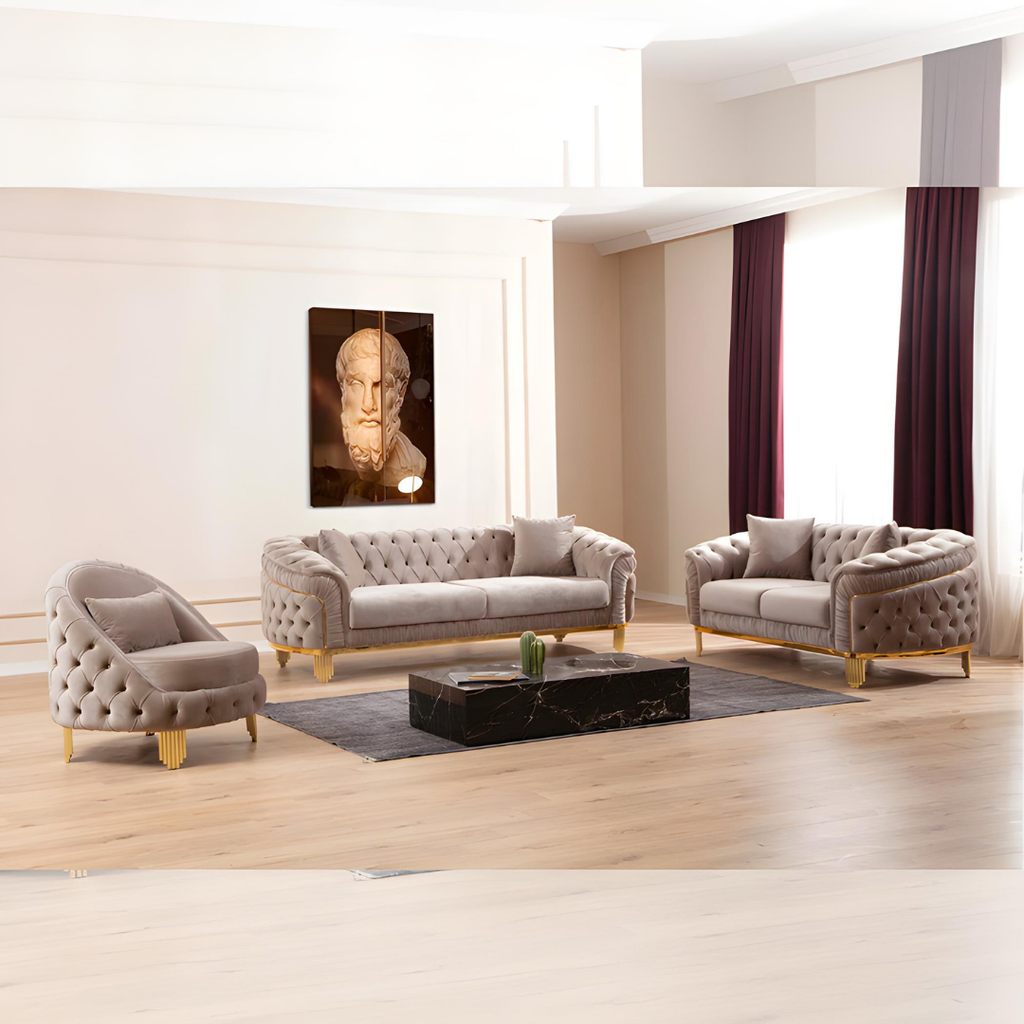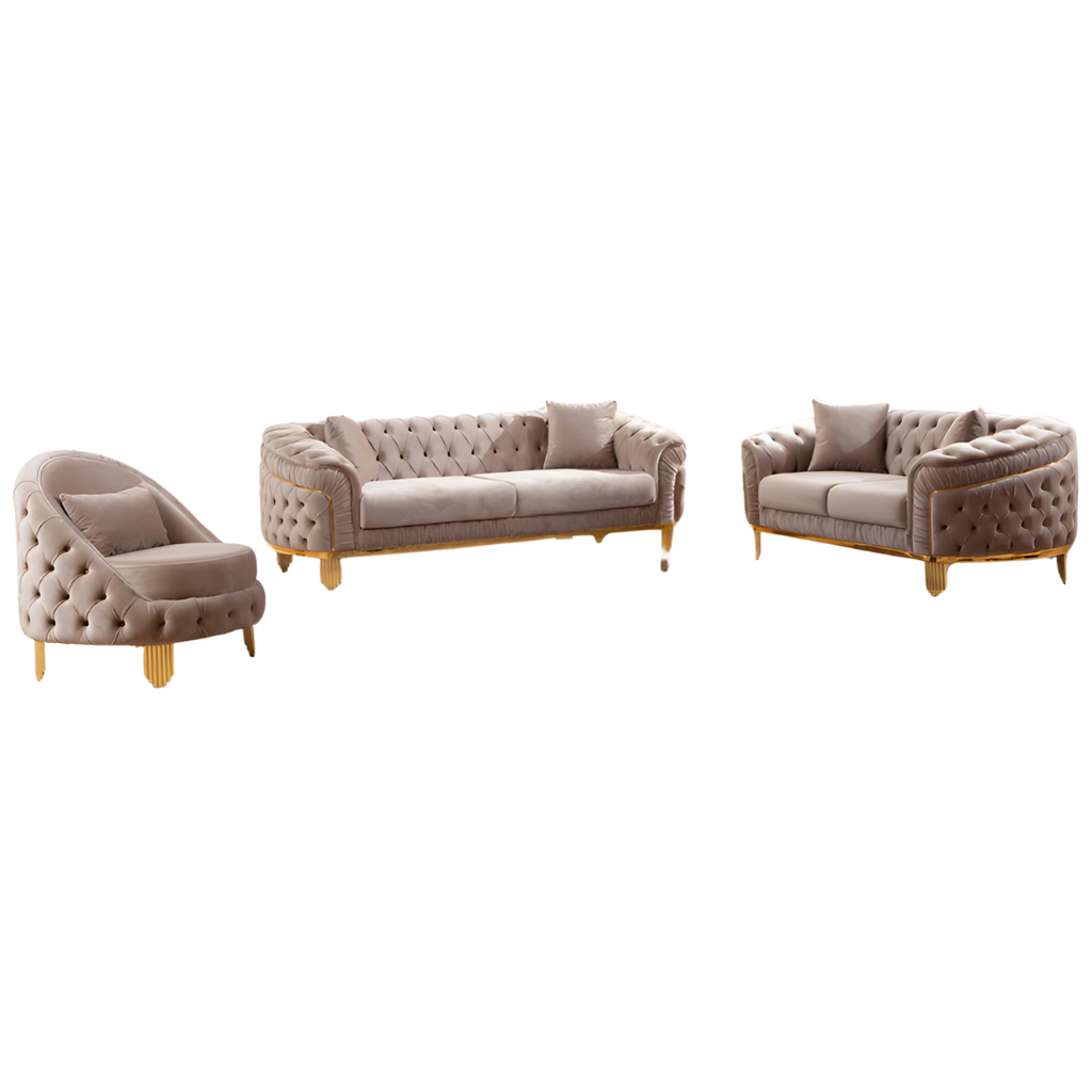 Luxurious taupe velvet living room set with deep tufting, gold-finished legs, and plush seating. Includes sofa, loveseat, and chair for a coordinated, high-end look in any living space.