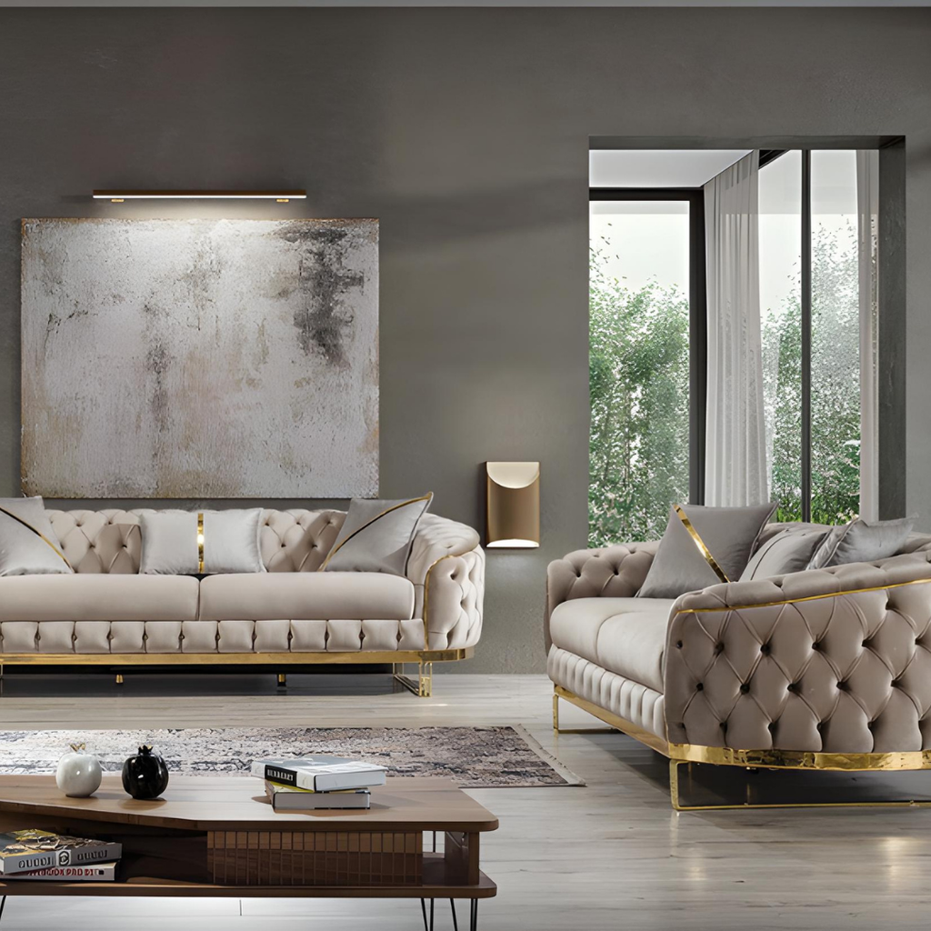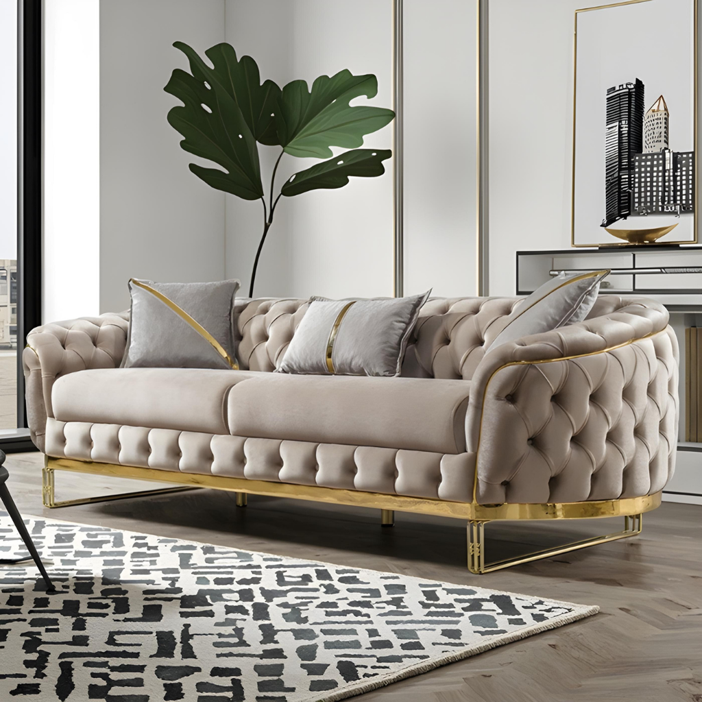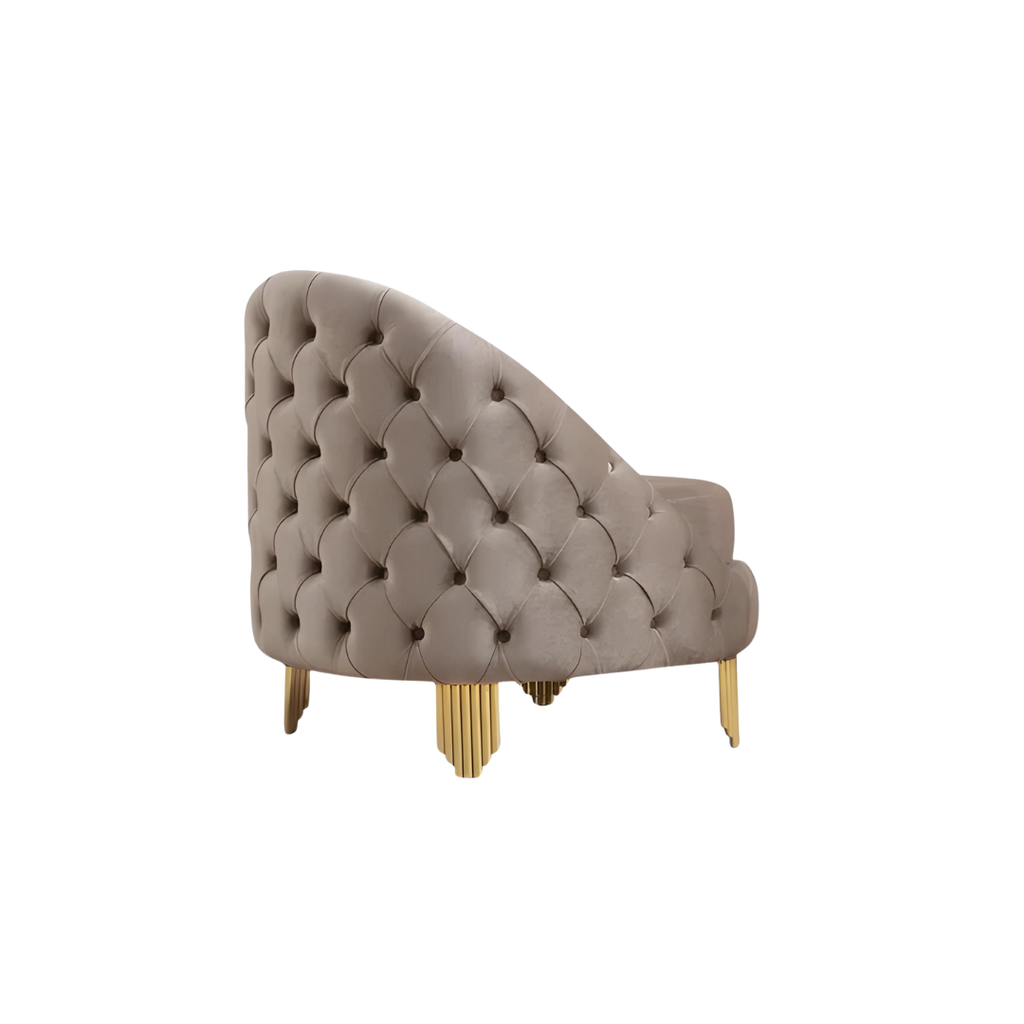 Luxurious taupe velvet living room set with deep tufting, gold-finished legs, and plush seating. Includes sofa, loveseat, and chair for a coordinated, high-end look in any living space.