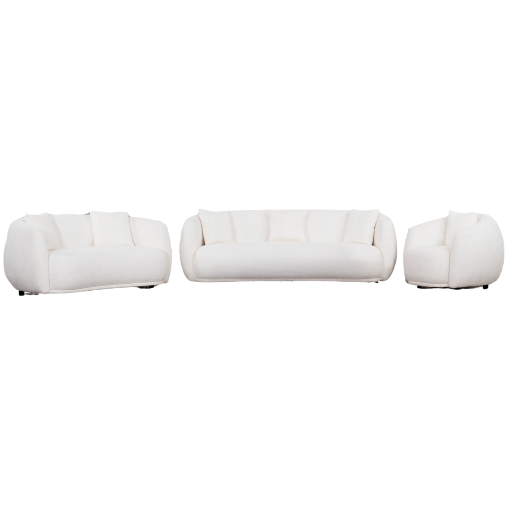 A sculptural 3-piece boucle living room set combining organic curves, plush comfort, and a modern minimalist aesthetic.