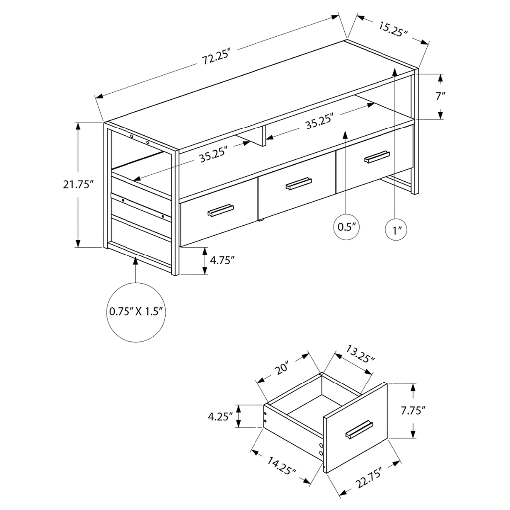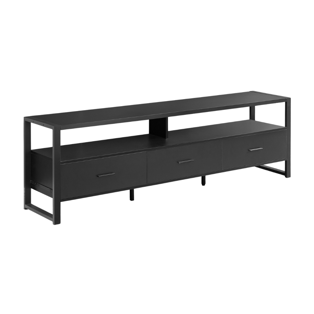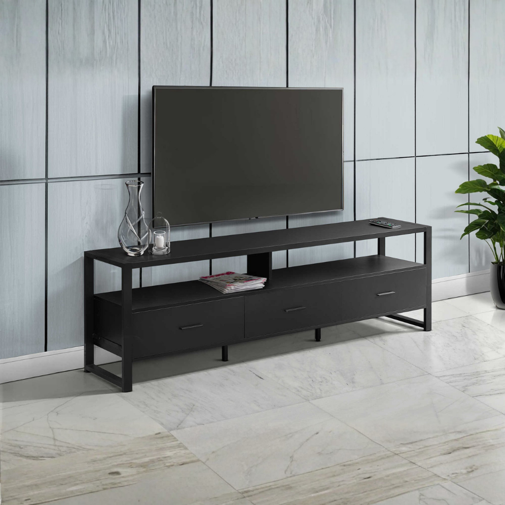 A sleek 72" contemporary TV stand combining a full black laminate finish with a modern black-metal frame. Fenlo offers open shelving, smooth-glide drawers, and a clean minimalist layout for streamlined media organization.