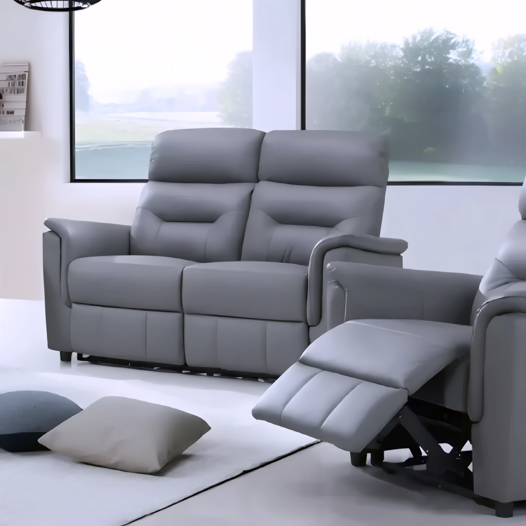The Kargus power recliner set combines modern convenience with premium comfort. Upholstered in light grey genuine leather/match, each piece is built for durability and a refined look suitable for any contemporary space.