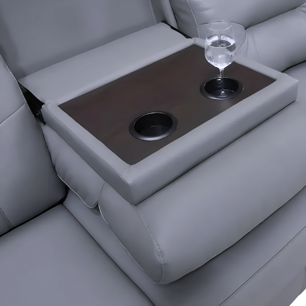 The sofa features two smooth power recliners along with a drop-down tray equipped with cupholders and USB ports—perfect for movie nights or charging devices.