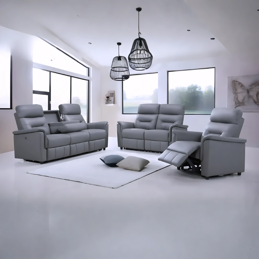 A modern 3-piece power recliner set crafted in genuine leather/match, featuring smooth power mechanisms, USB charging, and a functional drop-down tray for elevated everyday comfort.