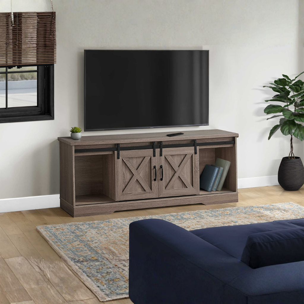 A 60" modern TV stand in a warm dark-taupe laminate finish, featuring sliding barn doors, open cubbies, and adjustable storage for organized entertainment spaces.