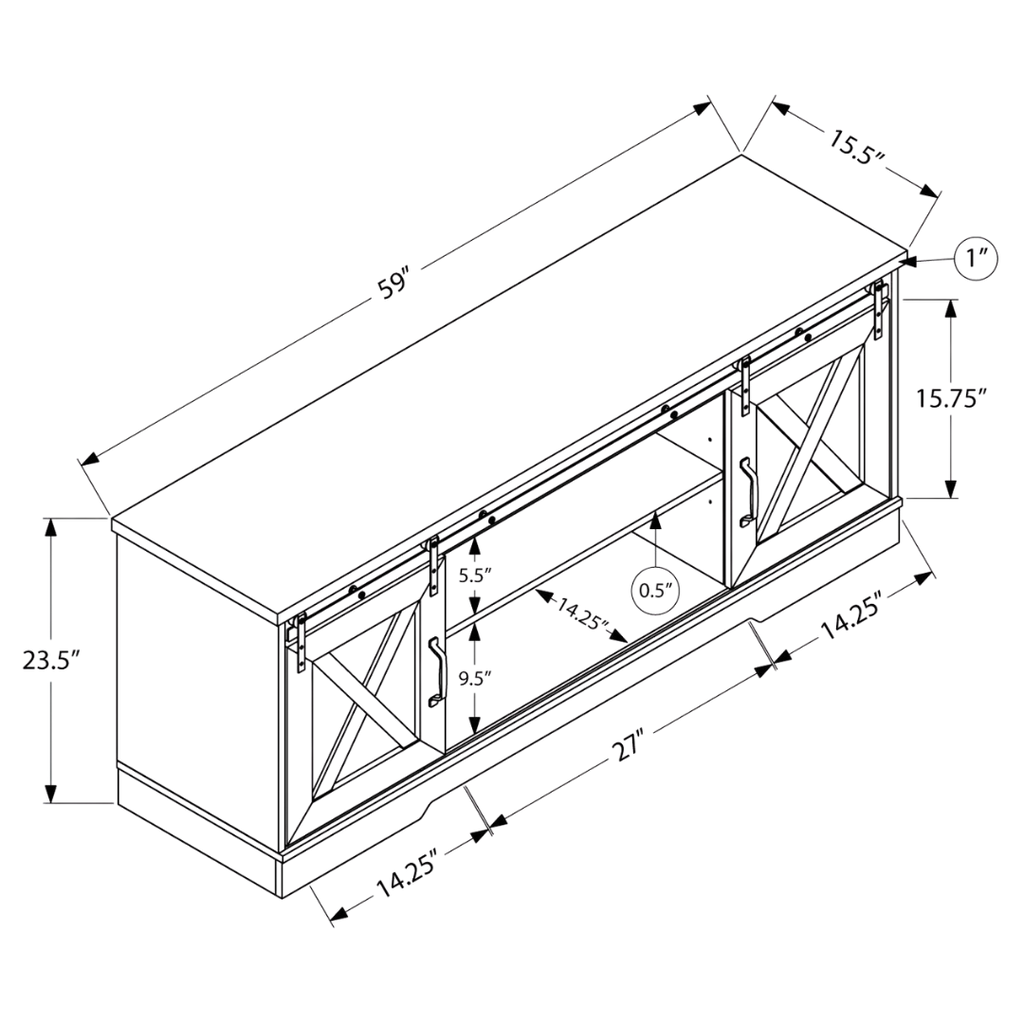 The dark taupe Karvo offers a warm, textured wood-look finish paired with functional farmhouse design. Sliding barn doors move smoothly across the black metal rail, allowing you to reveal or conceal storage as needed. The adjustable central shelf and open cubbies create a flexible setup for media components. Cable management ensures a clean aesthetic. Built for durability and easy assembly, this 60" unit enhances cozy, neutral-toned living areas.