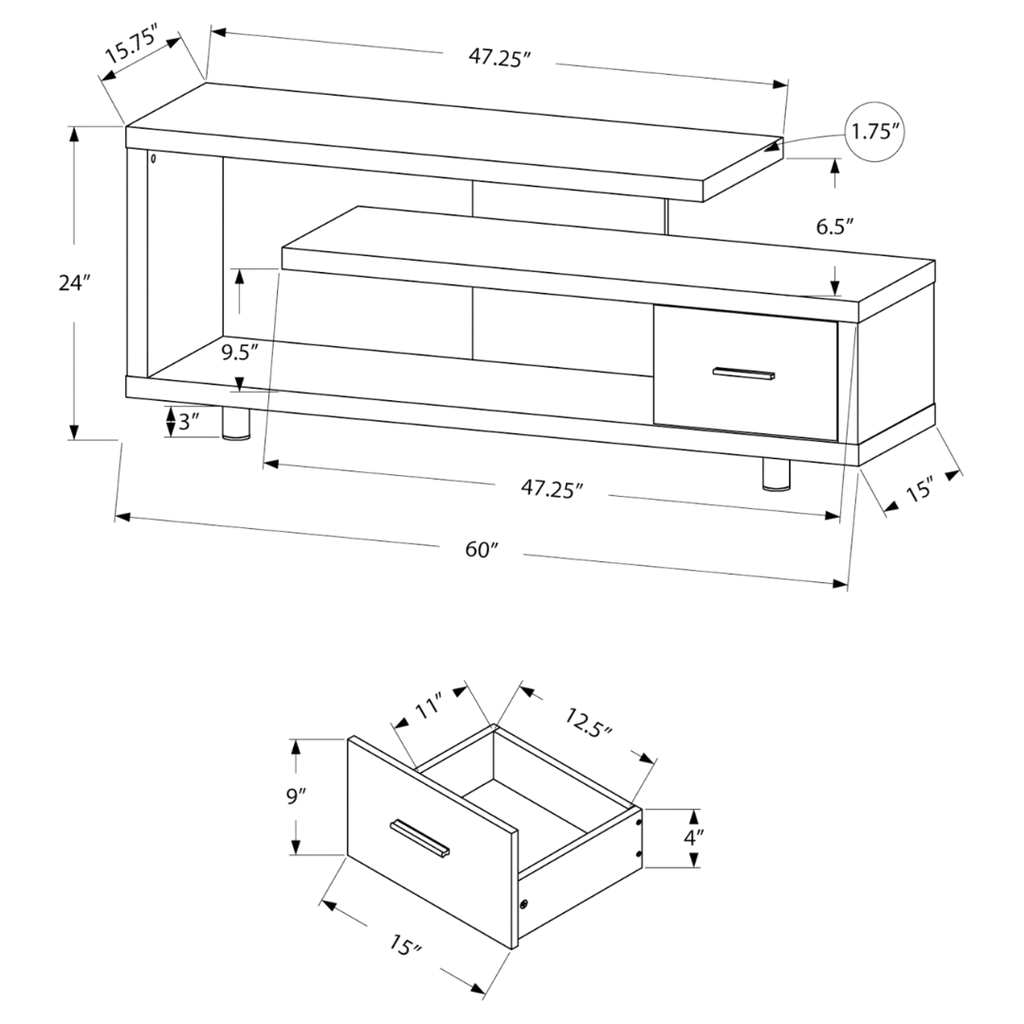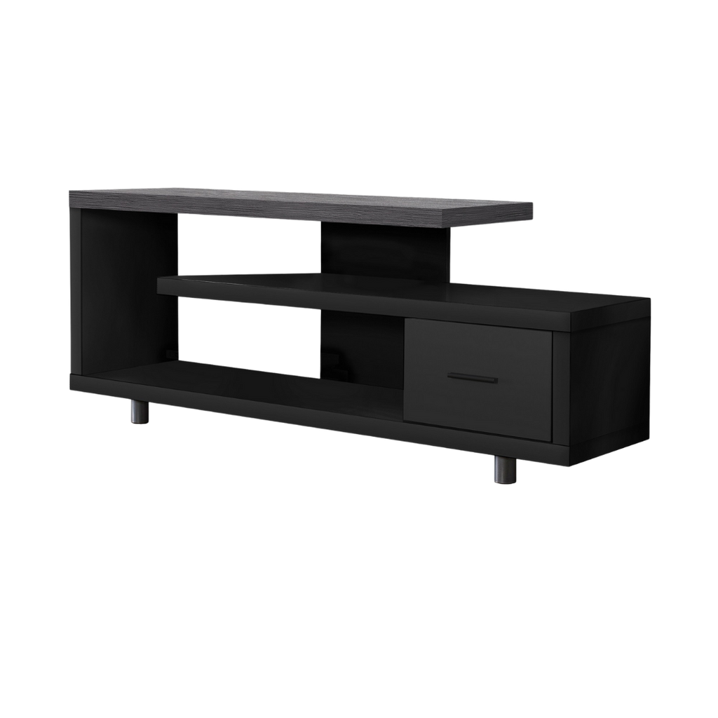 A modern 60" Art-Deco inspired TV stand combining a grey wood-look top with a black finish, offering bold asymmetry, open shelving, and a practical storage drawer. Designed for TVs up to 60", Kelren blends décor display with efficient media organization.