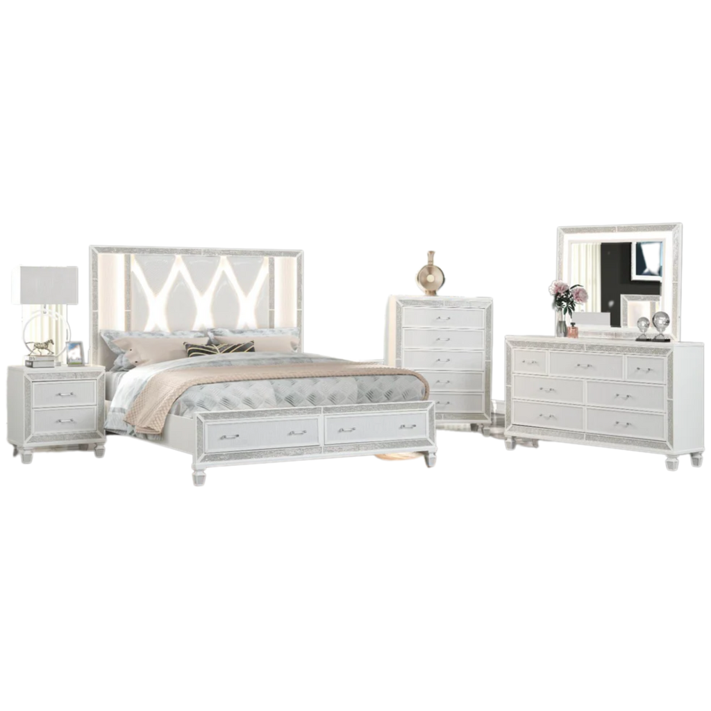 Make a bold, sophisticated statement with the Crystal King Bedroom Set, featuring a diamond-pattern LED headboard, glossy white finish, and luxury design from top to bottom.