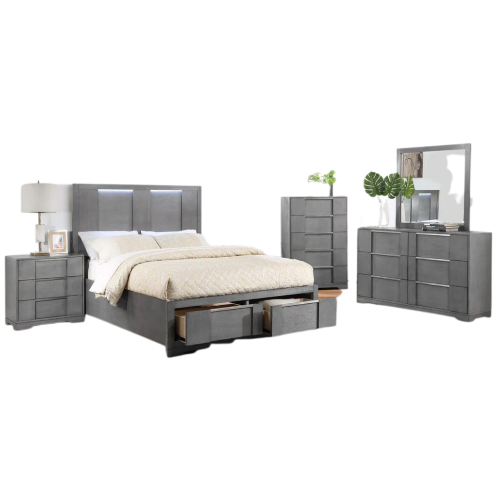 The Kylie King Bedroom Set offers grandeur, comfort, and classic elegance. With its tufted panels, refined silver finish, and ornate details, this complete set is ideal for turning your master suite into a luxurious haven.