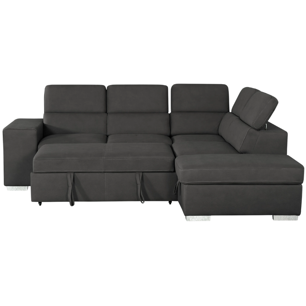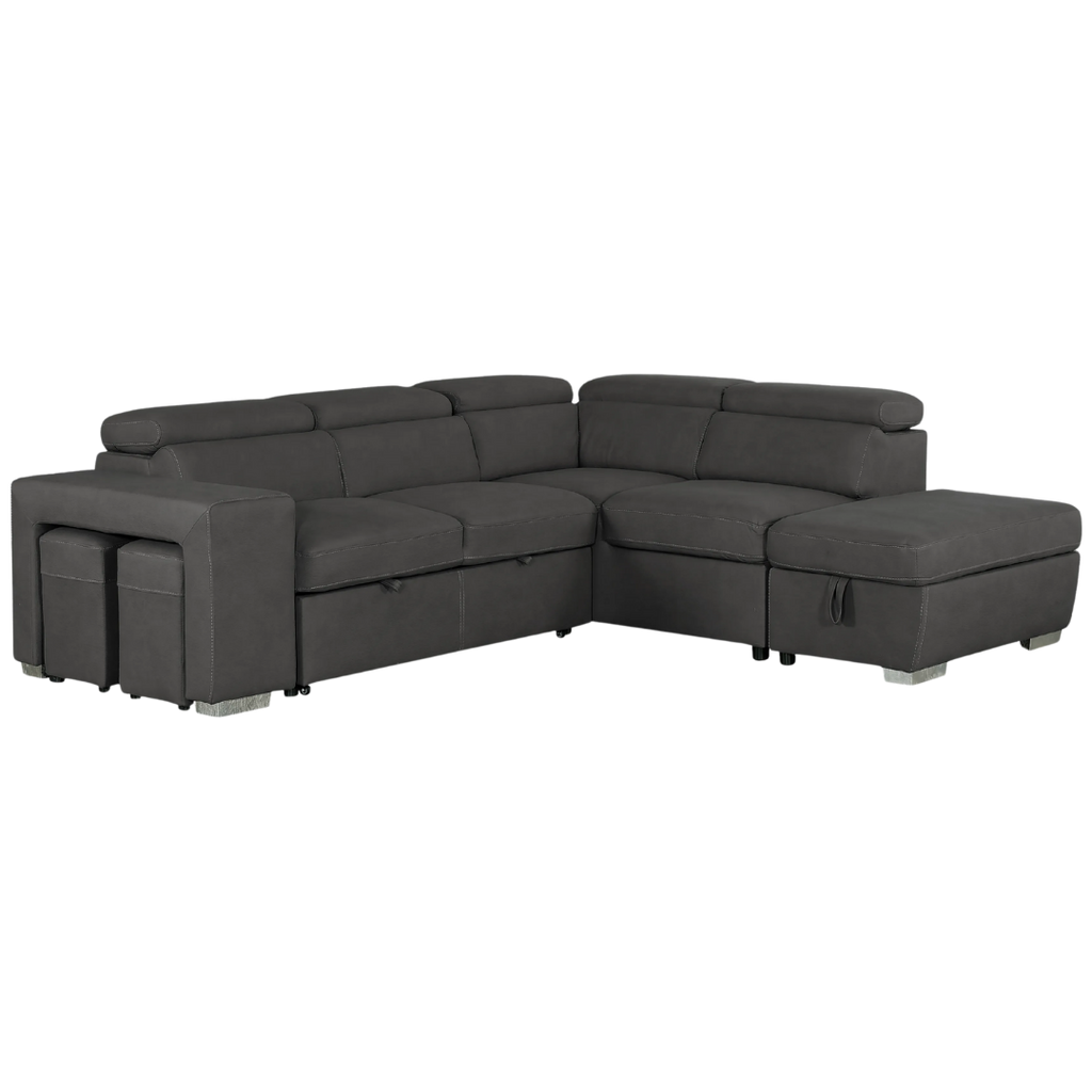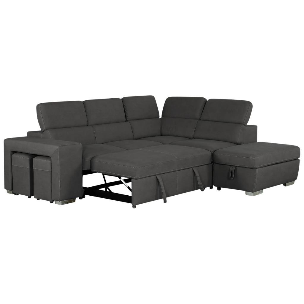 A multifunctional charcoal sectional featuring adjustable headrests, a full pull-out sleeper, a storage ottoman with integrated stools, and a right-hand facing chaise. Designed for large living spaces that need flexibility, comfort, and built-in functionality.