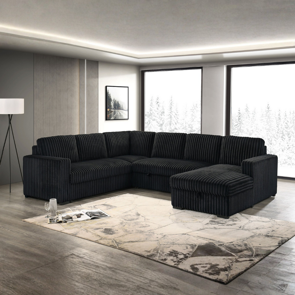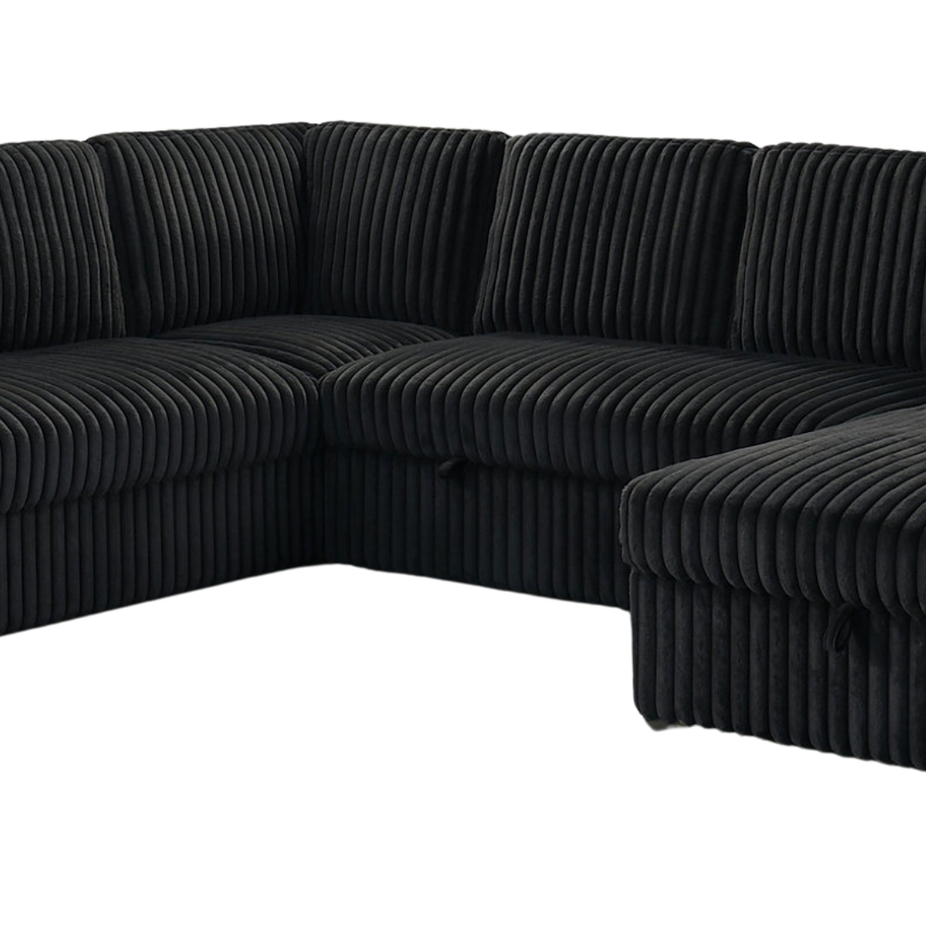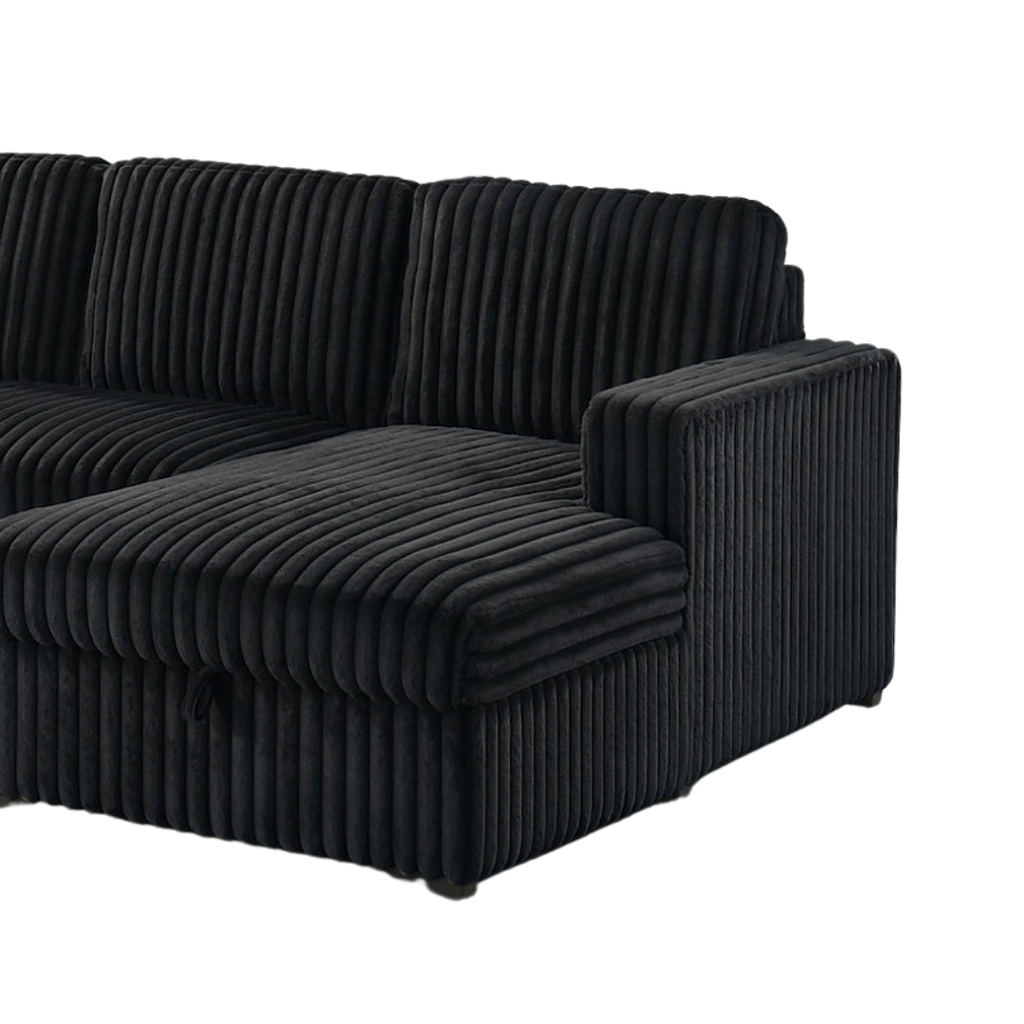 A deep black corduroy sofa bed sectional featuring plush cushions, a large sleeper, and integrated chaise storage. Bold look, ultra-comfortable seating.