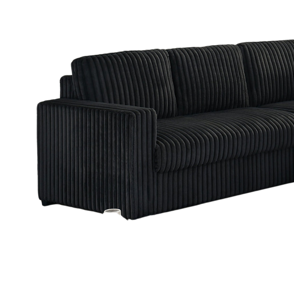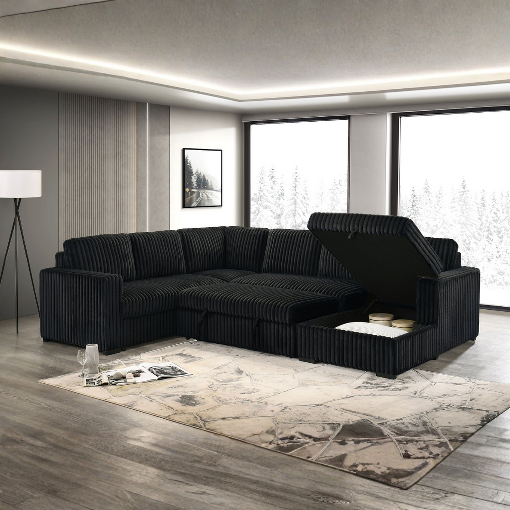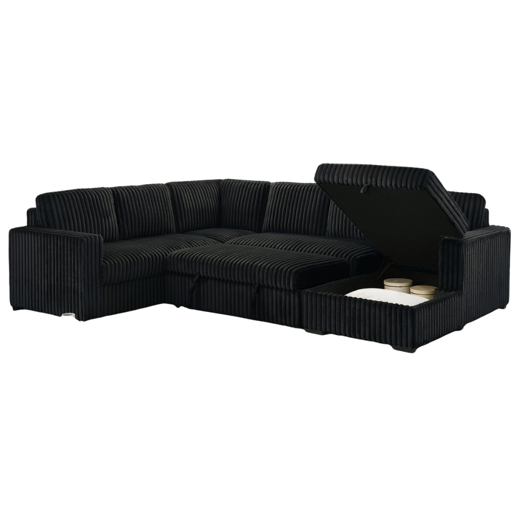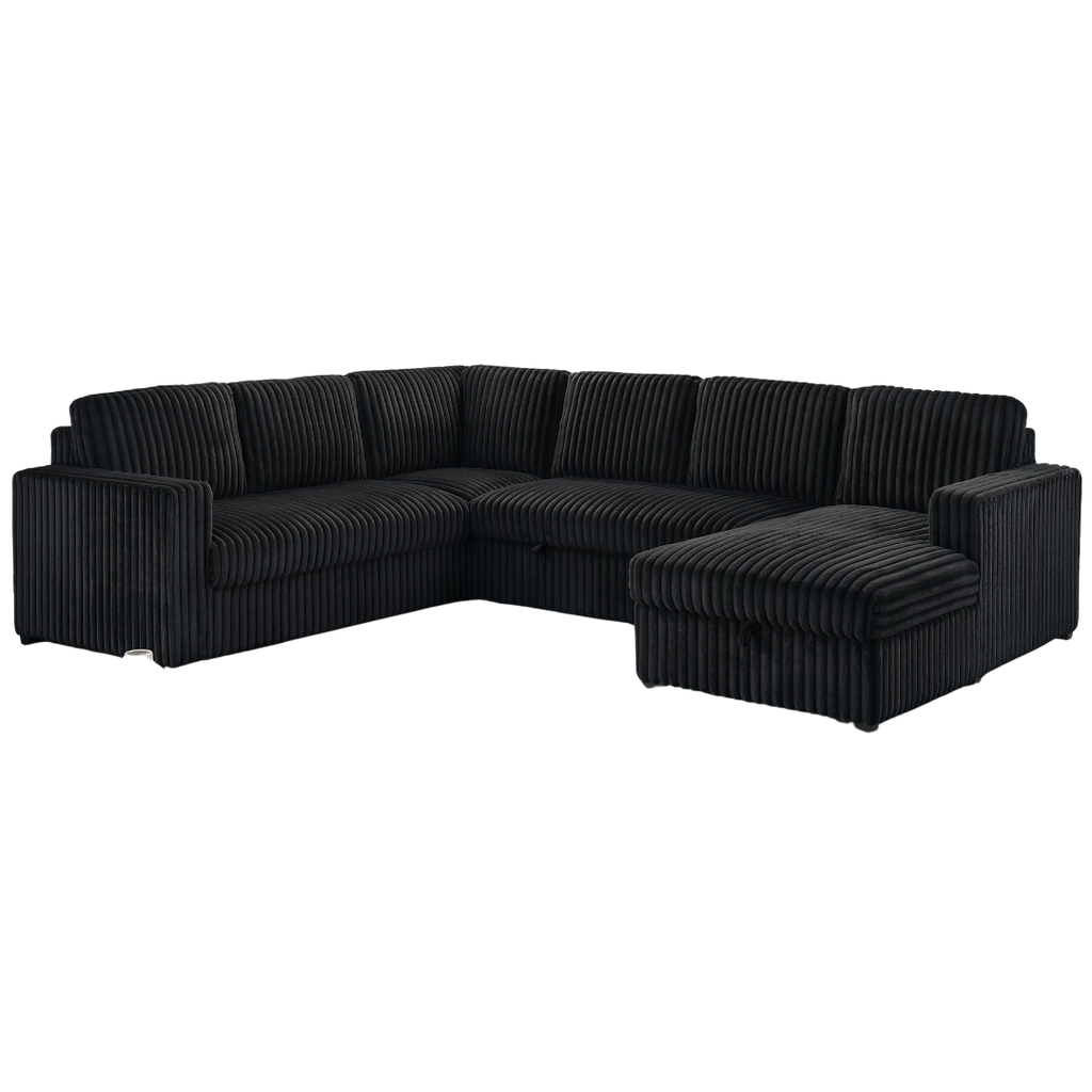 A deep black corduroy sofa bed sectional featuring plush cushions, a large sleeper, and integrated chaise storage. Bold look, ultra-comfortable seating.