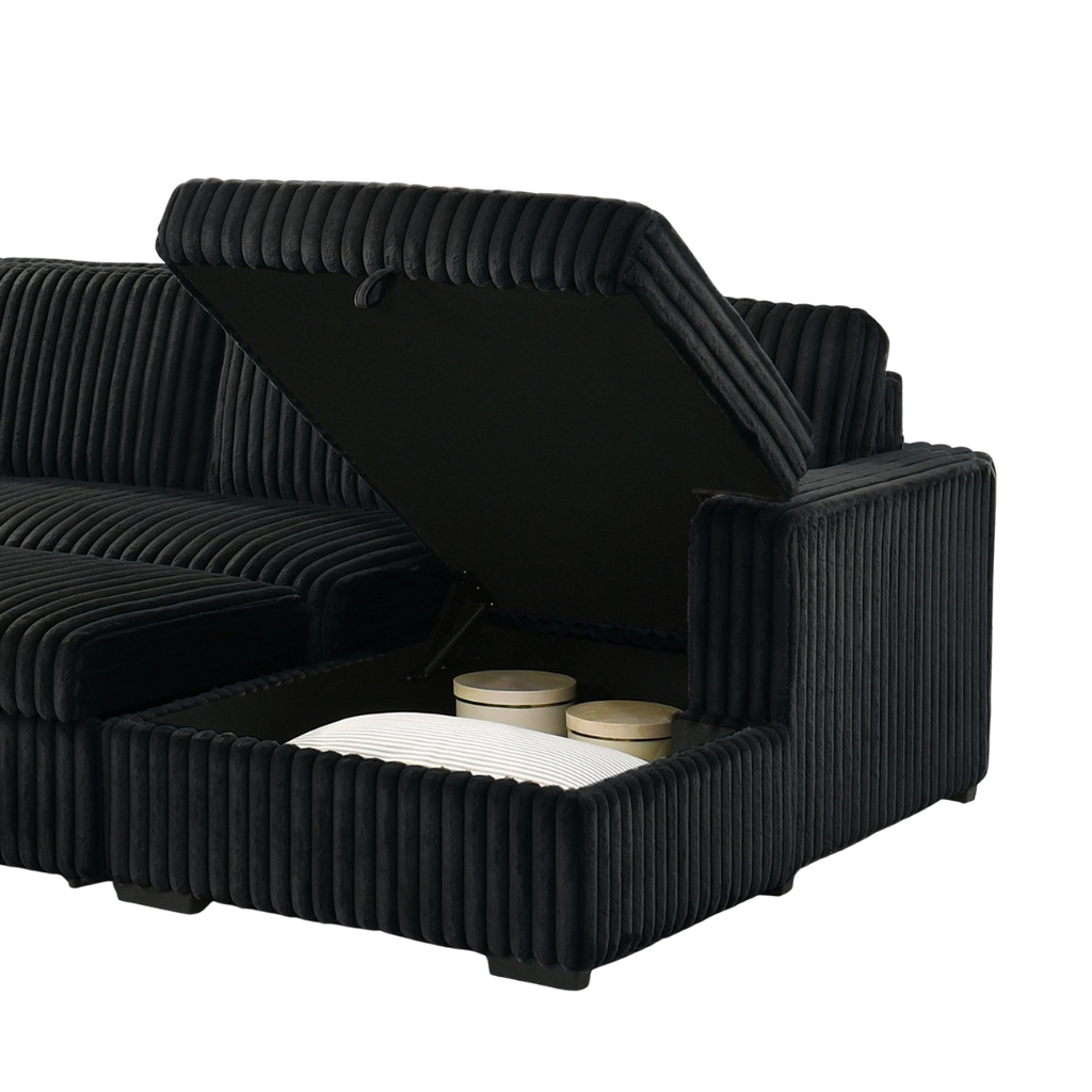 The Lirven Black offers an elevated modern look with its rich corduroy texture and wide seating profile. Plush cushions create a relaxing lounge feel, while the storage chaise keeps essentials organized.