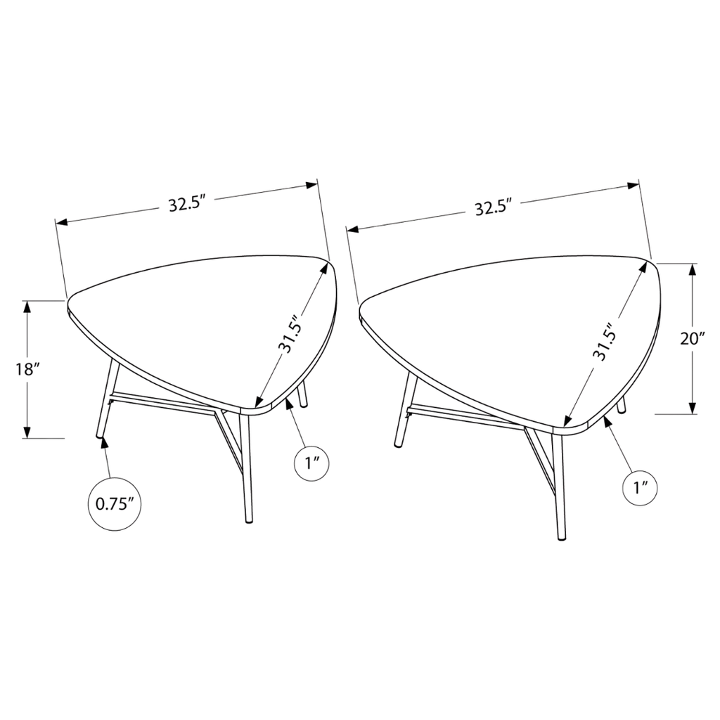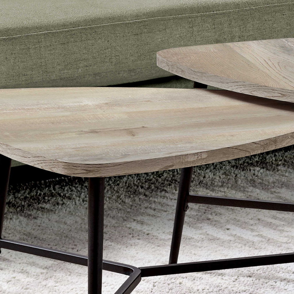 The Lola table set features two triangular taupe wood-look surfaces supported by black metal tripod legs, blending mid-century inspiration with a clean contemporary edge. Both tables share the same top size but vary in height, allowing them to nest for compact storage or be arranged creatively for a layered look. Their open-frame design provides stability without visual bulk, making the set ideal for small living areas, modern condos, or multifunctional spaces. Durable laminate surfaces keep maintenance simple while offering generous room for décor, books, or everyday essentials.