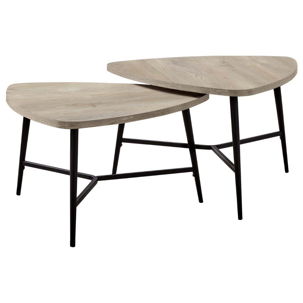 A 2-piece nesting coffee table set featuring taupe wood-look triangular tops and black metal tripod legs, designed to deliver a mid-century aesthetic with practical space-saving versatility.