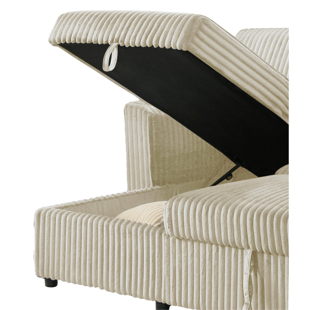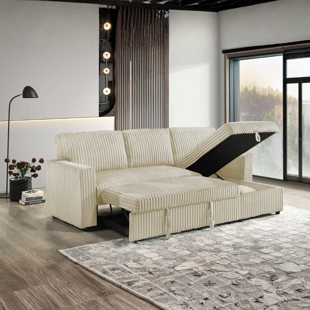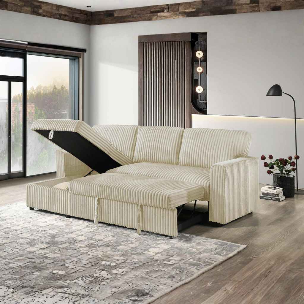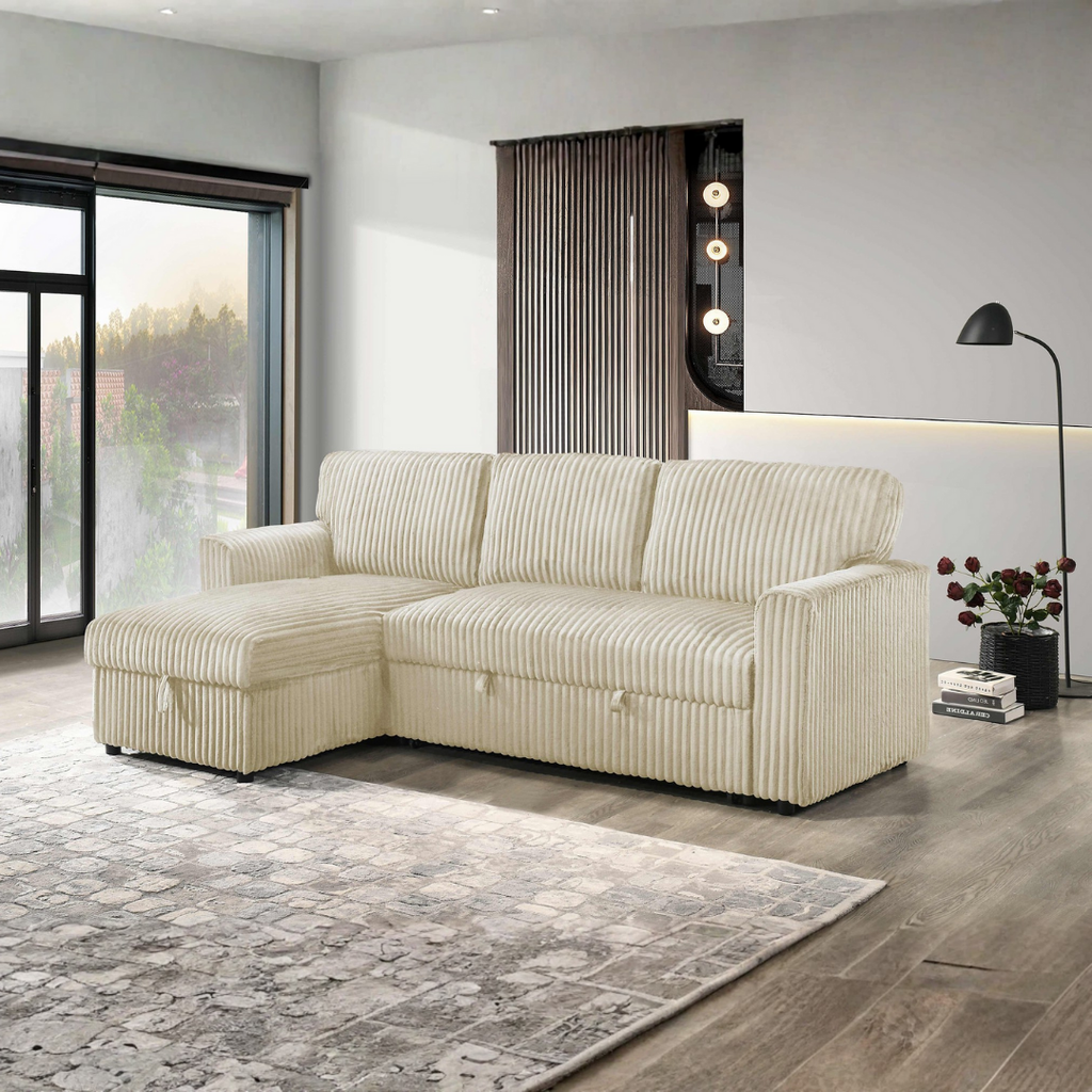 A reversible corduroy sofa bed sectional offering plush comfort, built-in storage, and a pull-out sleeper—ideal for warm, contemporary interiors.