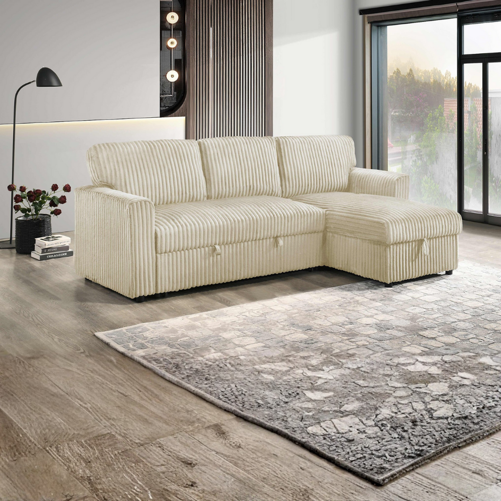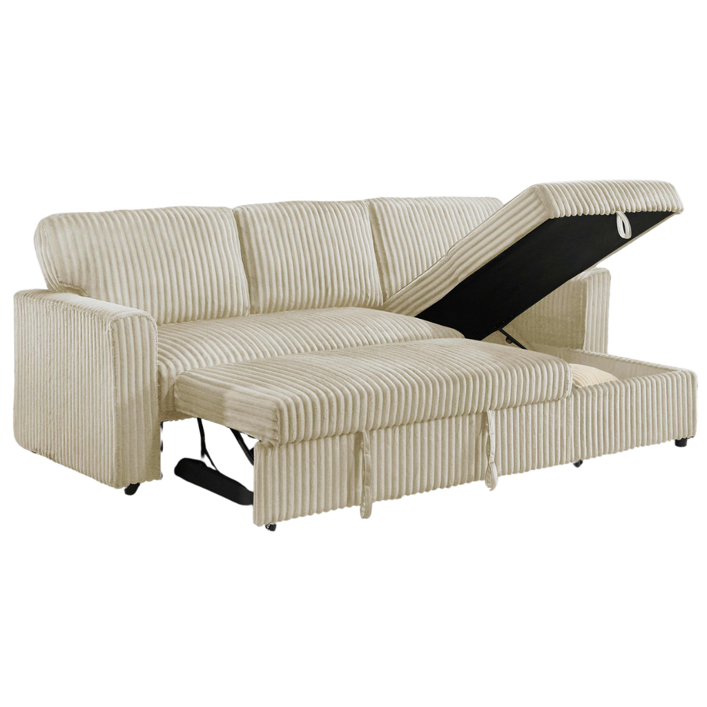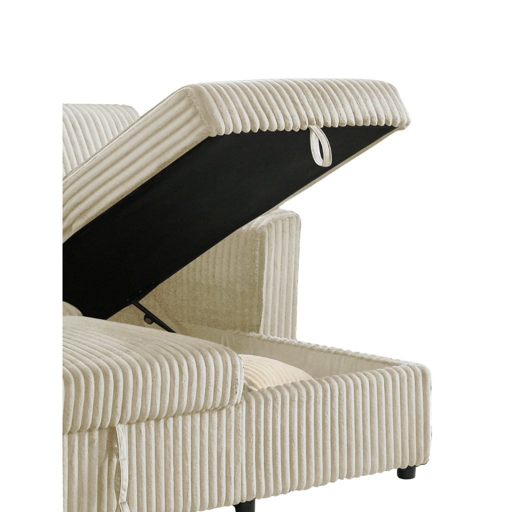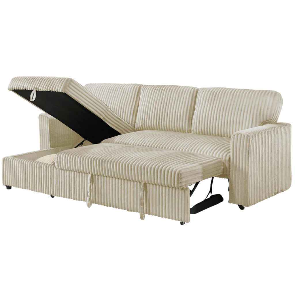 A reversible corduroy sofa bed sectional offering plush comfort, built-in storage, and a pull-out sleeper—ideal for warm, contemporary interiors.