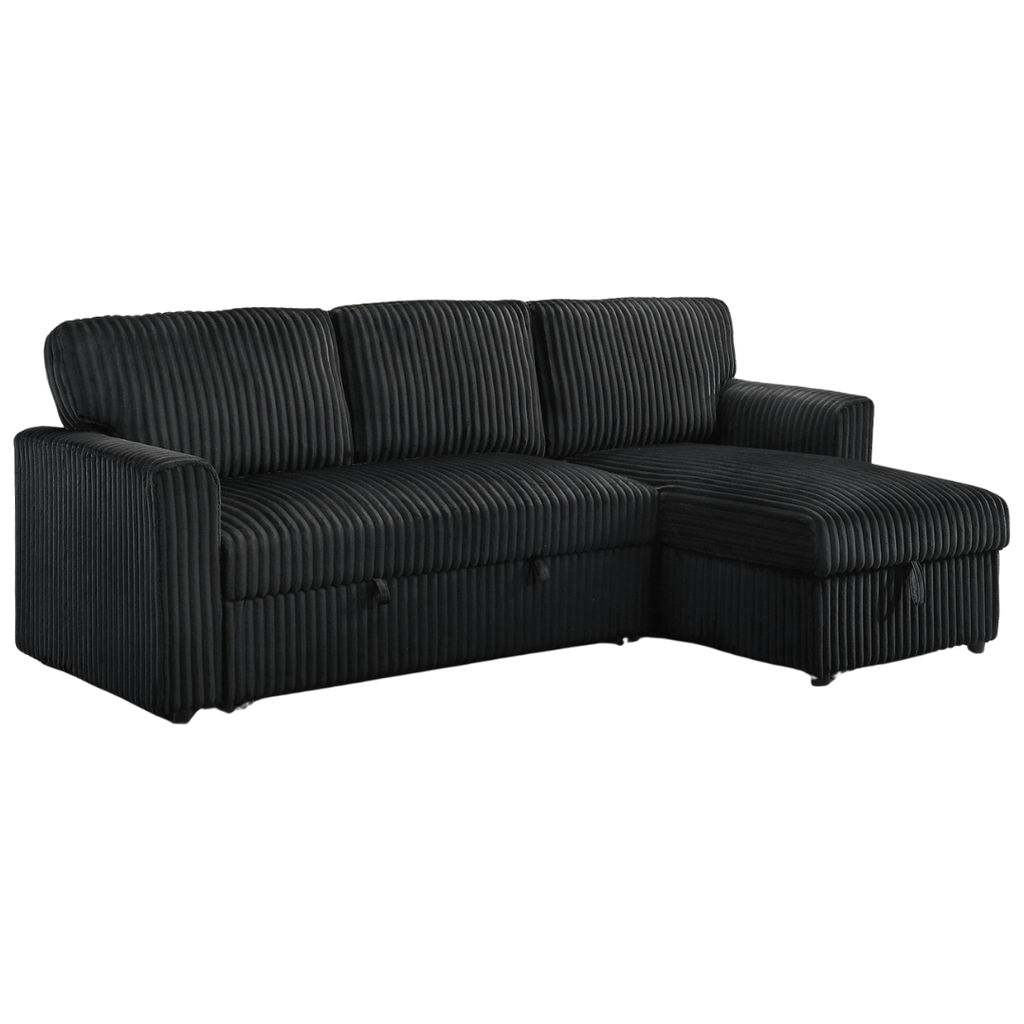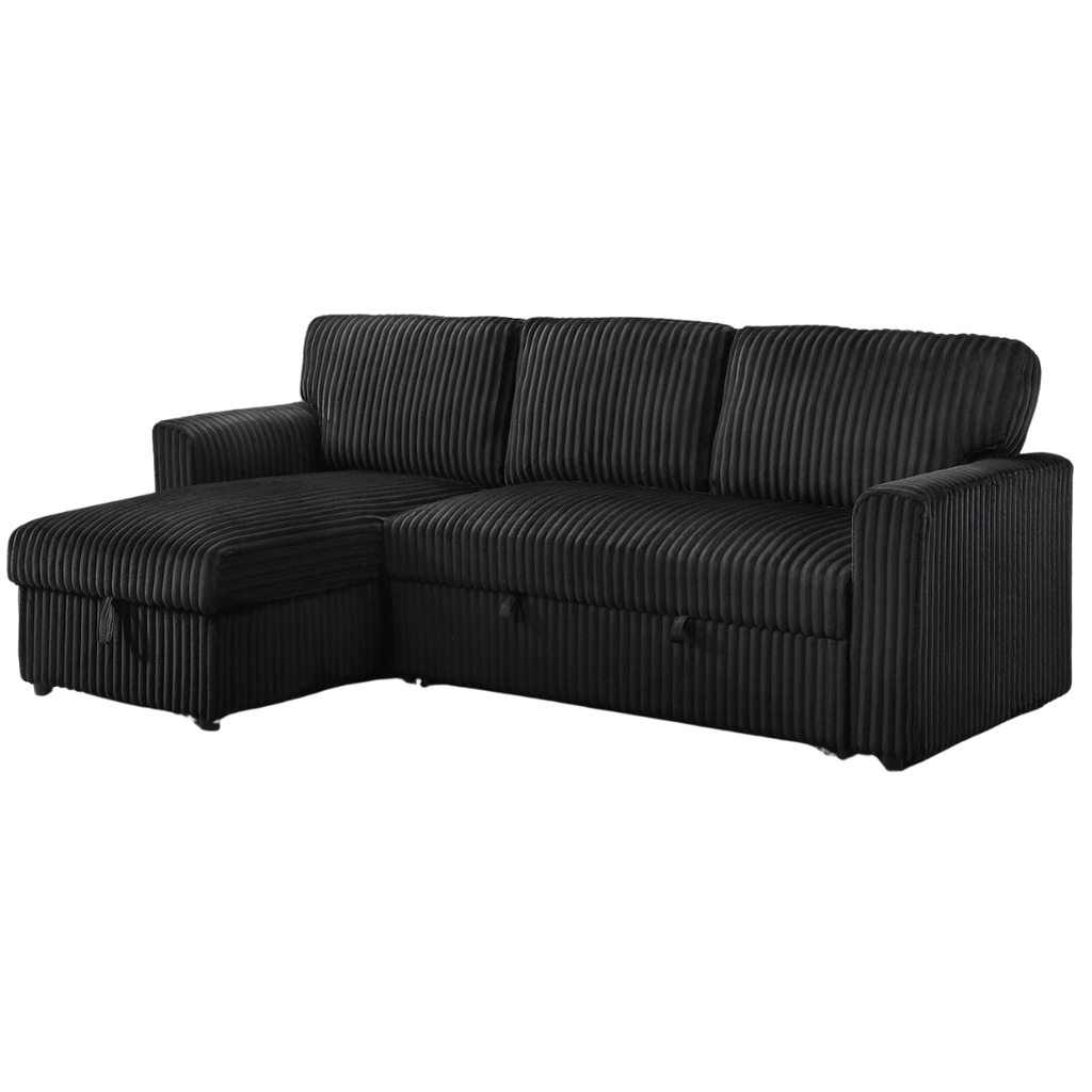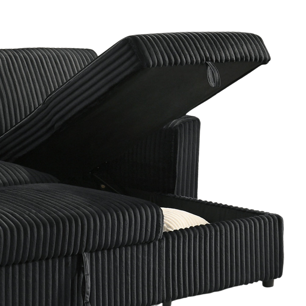 The Loremo Black sectional combines comfort, storage, and functionality in a compact design. Its reversible chaise offers flexible setup in any room layout, while the pull-out sleeper quickly transforms the sofa into a bed for guests. The lift-up storage bench is ideal for blankets, pillows, or everyday essentials, keeping your space organized.