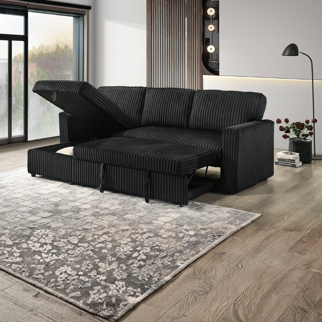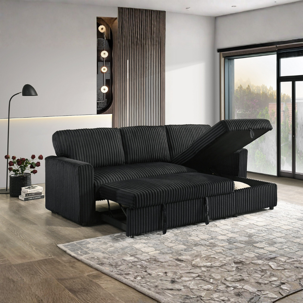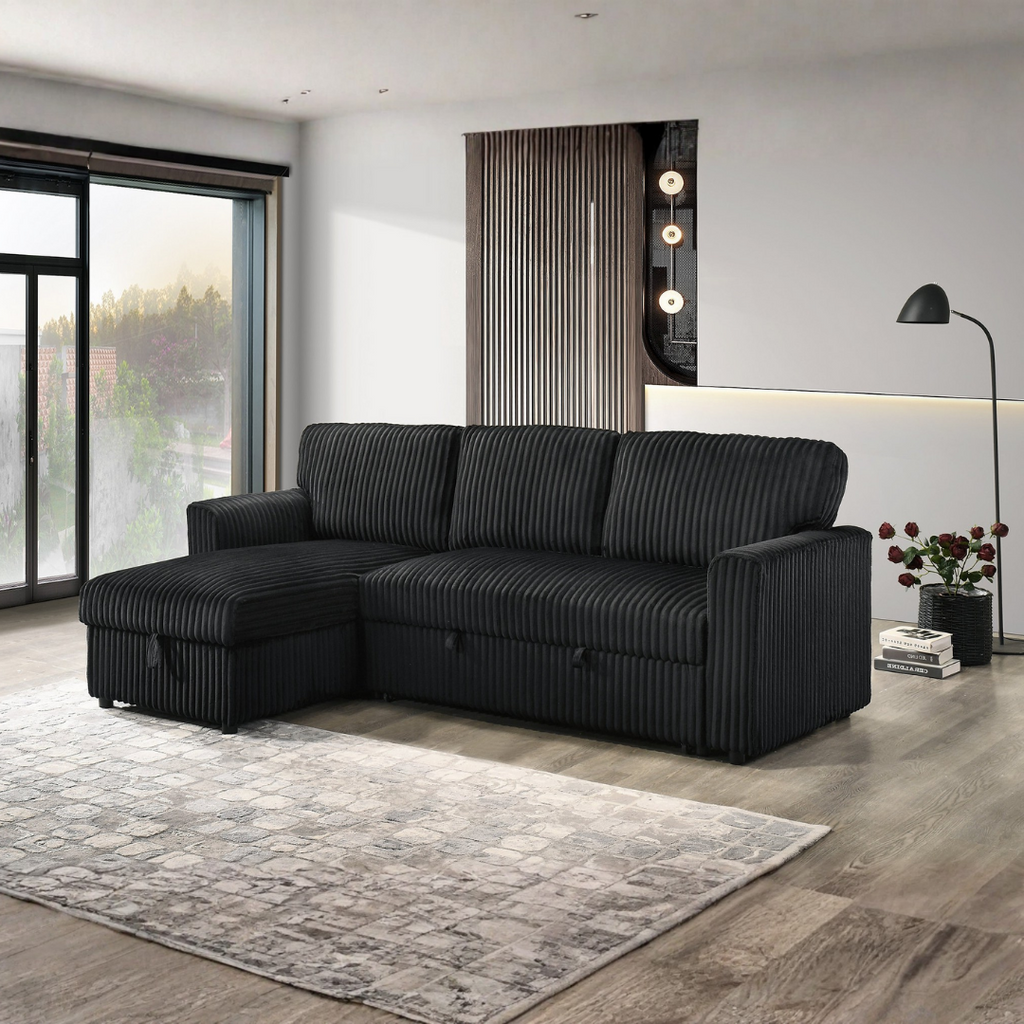 A reversible corduroy sofa bed sectional with plush seating, lift-up storage, and a smooth pull-out sleeper—designed for comfort, versatility, and modern living.