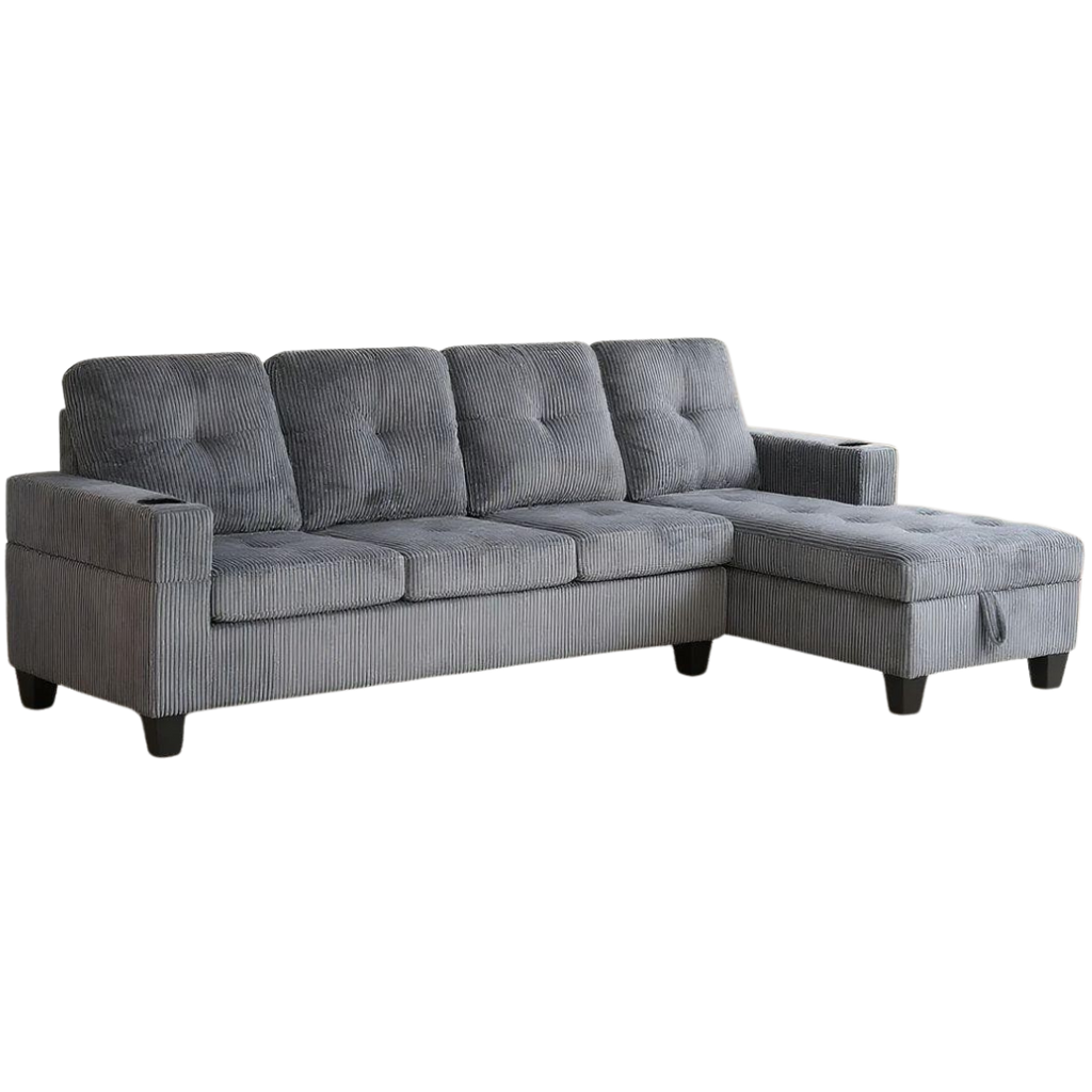 The Mara Grey sofa offers the perfect balance of practicality and comfort. Its built-in storage chaise gives you extra space exactly where you need it, while the corduroy fabric adds warmth and texture to any living room.