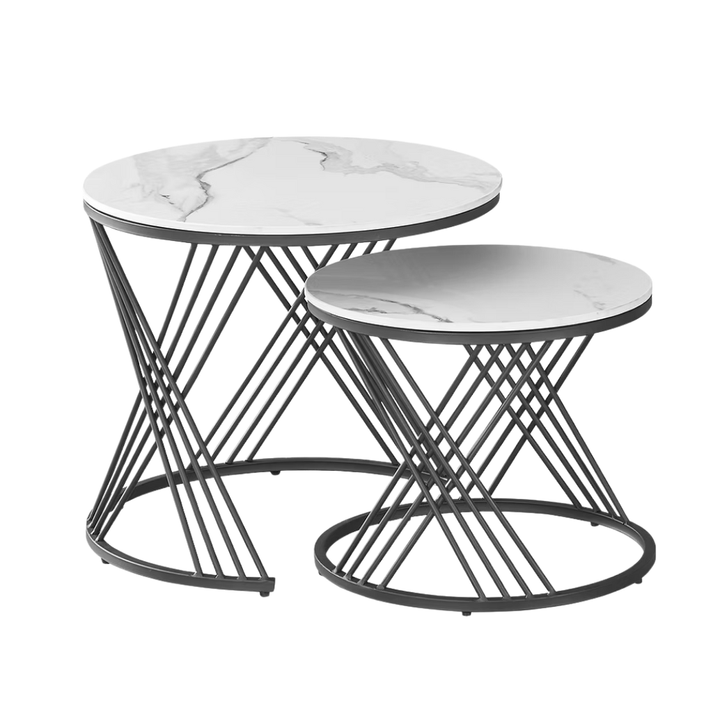 A 2-piece round coffee table set featuring white sintered stone marble-look tops and a sculptural black steel base, designed to bring a refined visual impact and flexible placement to modern living spaces.