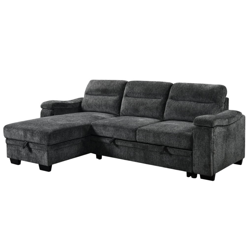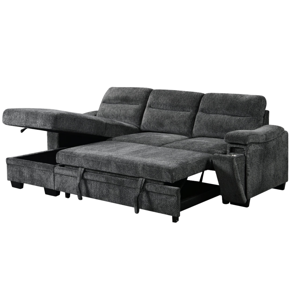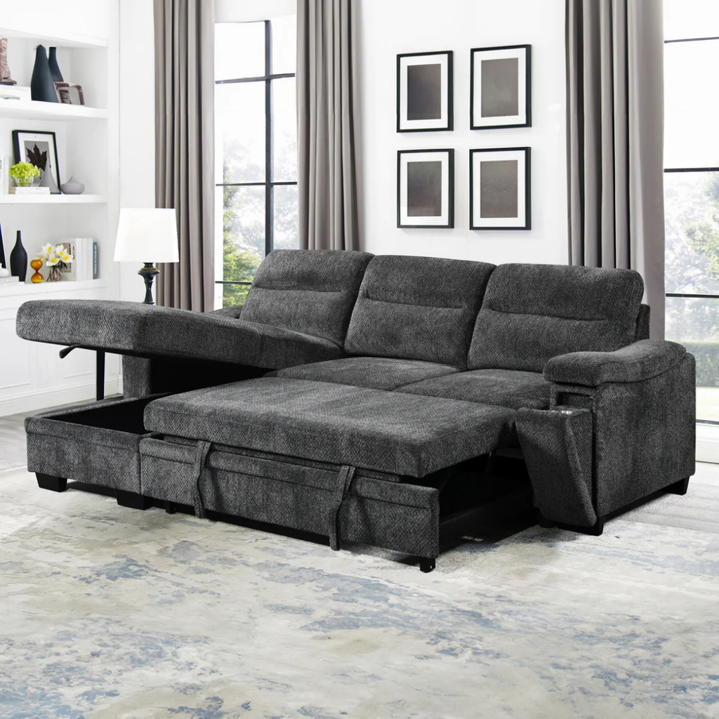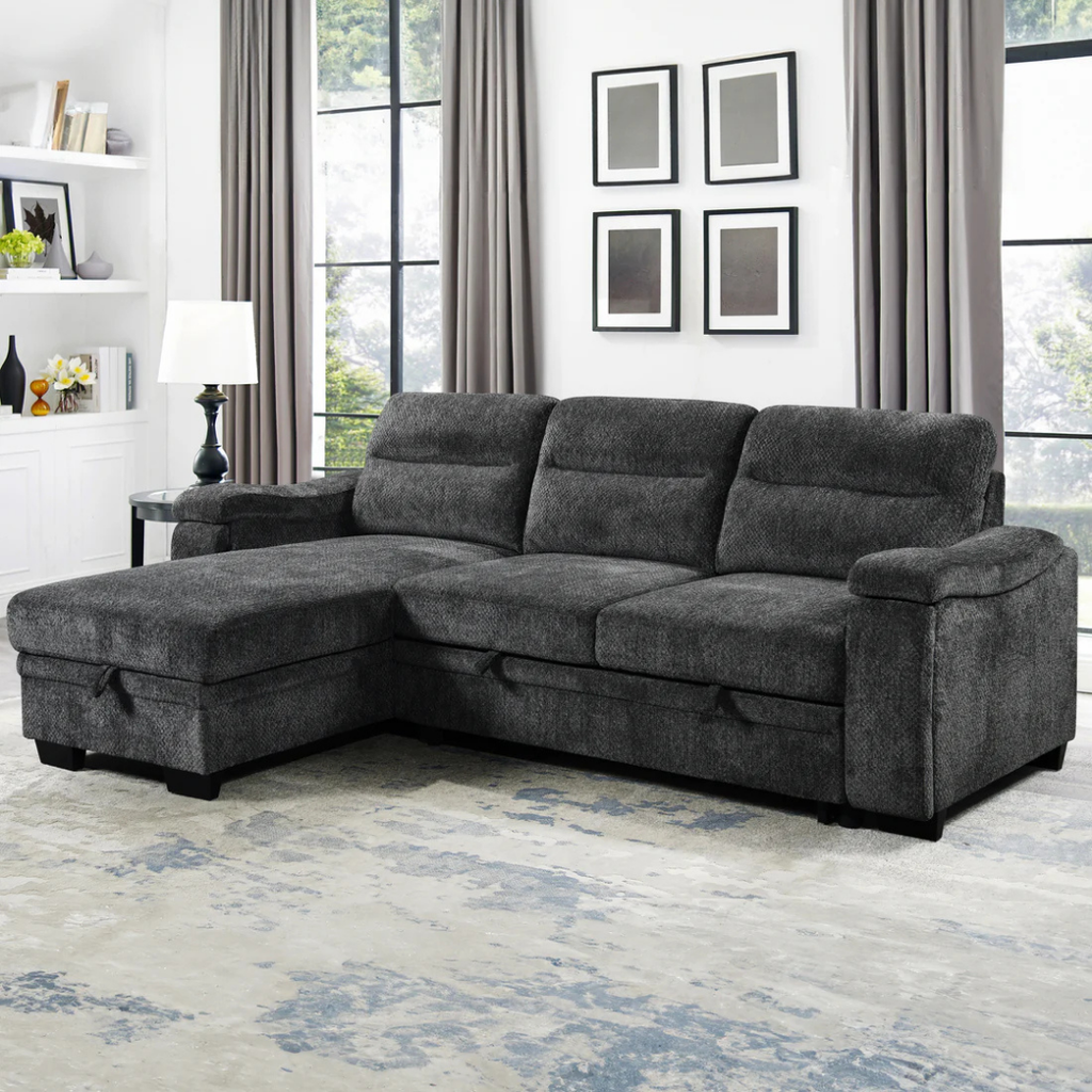 A multifunctional sleeper sectional offering storage, a pull-out bed, and a reversible chaise, designed for comfort and modern living.