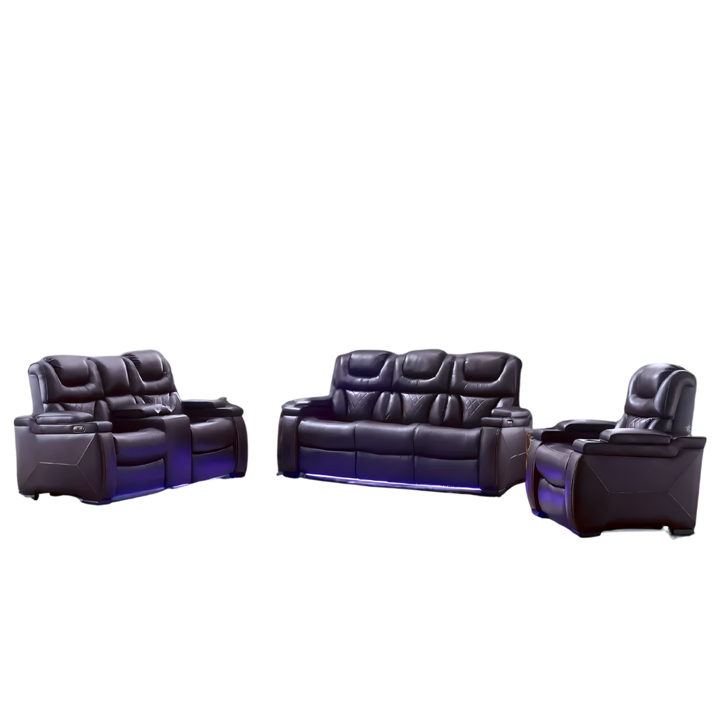 A premium leather-gel power recliner set designed for maximum comfort, featuring LED lighting, storage arms, and a functional drop-down console with power outlets. Ideal for modern living rooms seeking both luxury and convenience.