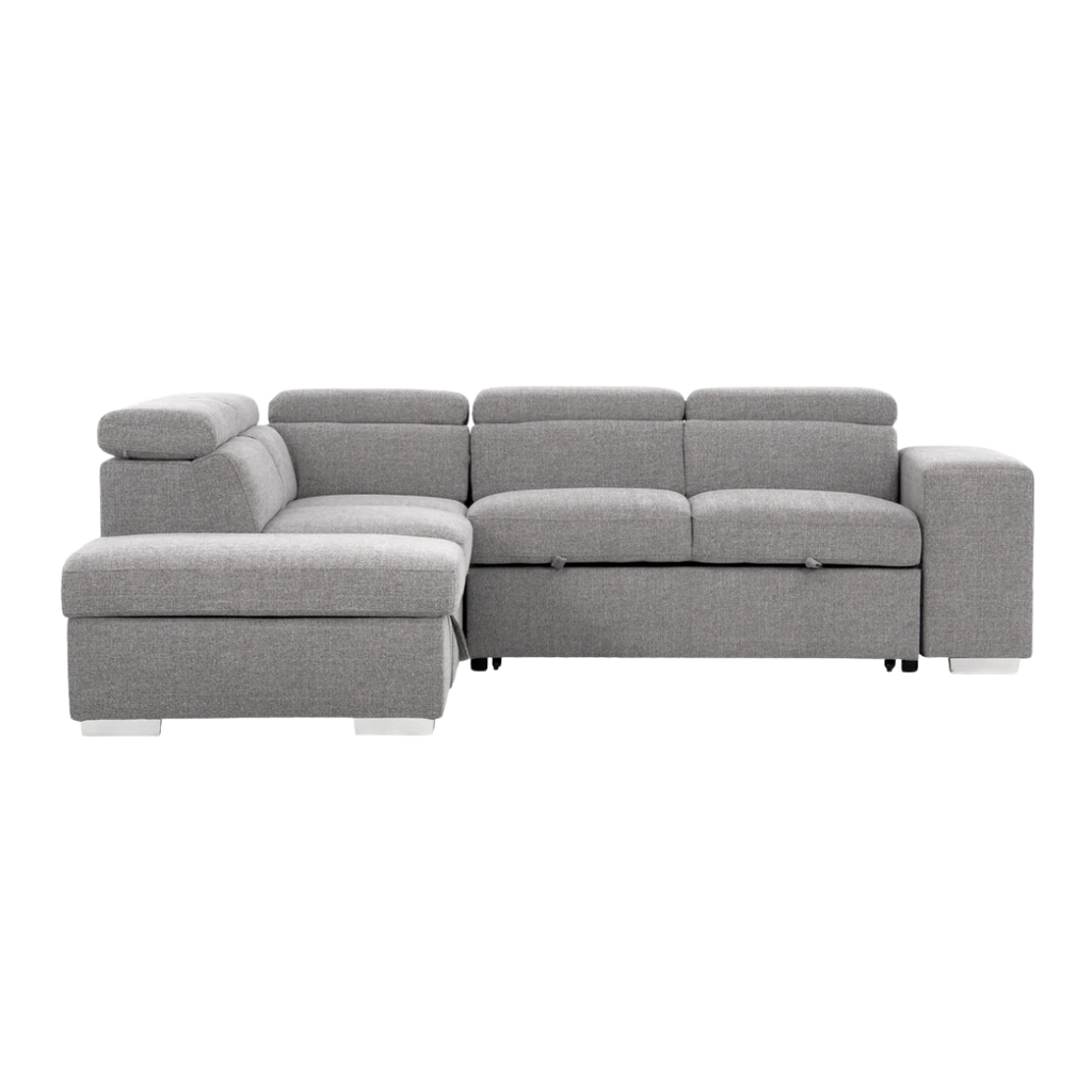 The Melaro sectional combines comfort, practicality, and clean modern styling. Its left-facing chaise lifts to reveal a full storage compartment ideal for blankets or pillows, while the pull-out sleeper quickly transforms the sofa into a spacious bed for guests.