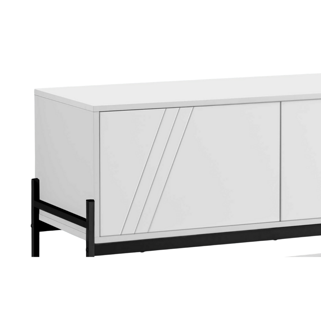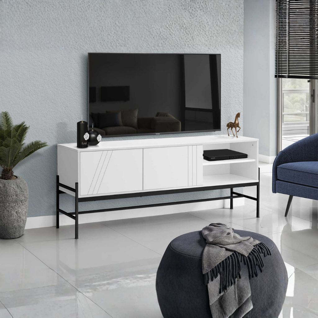 A crisp 60" contemporary TV stand combining a white laminate body with a black metal frame. Melro delivers functional storage, groove-line cabinet doors, and organized media placement with two concealed cable openings.