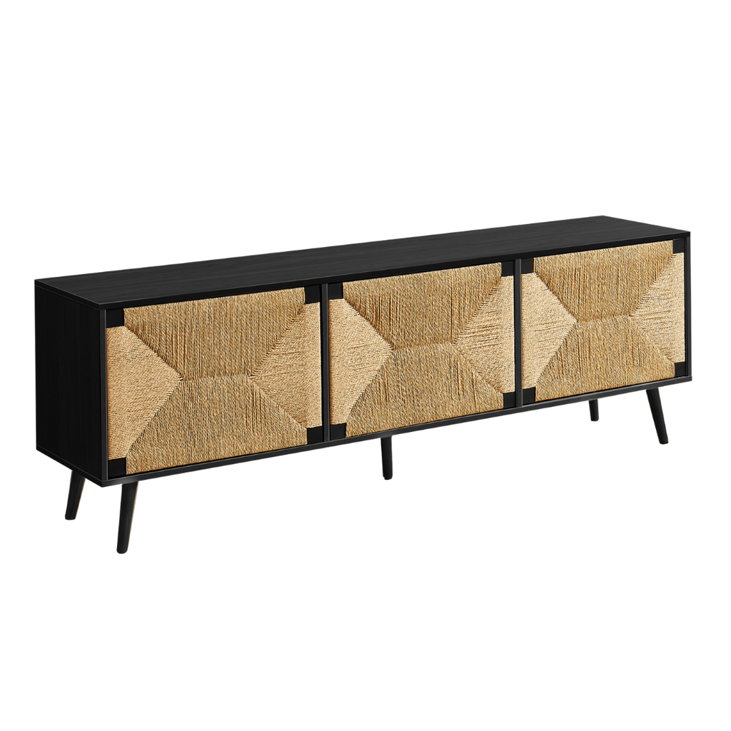 The Merlo TV stand brings a refined mid-century presence to any home. Its striking black frame contrasts with natural seagrass-look doors, creating a warm and modern visual impact. With three full cabinets, it offers generous hidden storage for electronics, books, and living-room essentials.