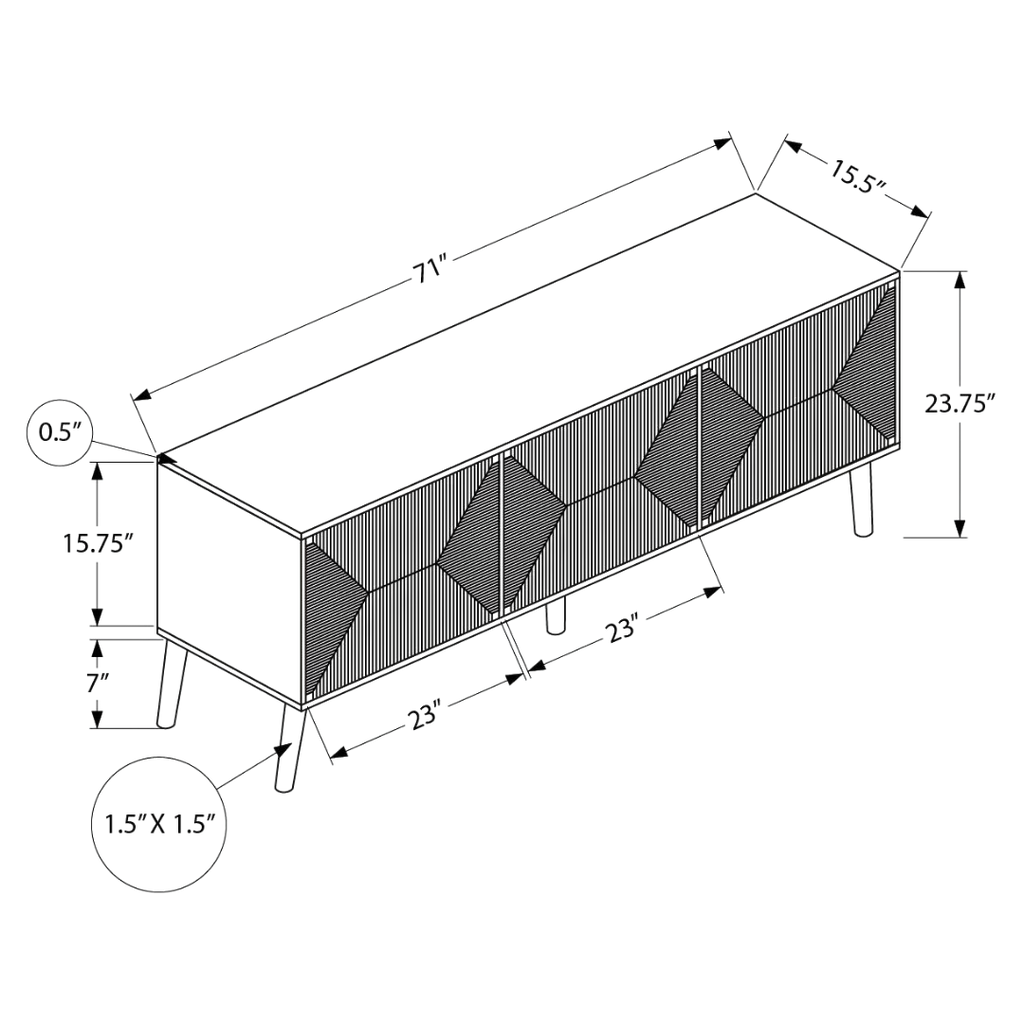 A 72-inch modern TV stand combining a sleek black finish with textured seagrass-look cabinet doors. The Merlo console delivers a clean, mid-century-inspired design with concealed storage, an adjustable shelf, and efficient cable management—ideal for contemporary living rooms seeking a stylish and functional media solution.