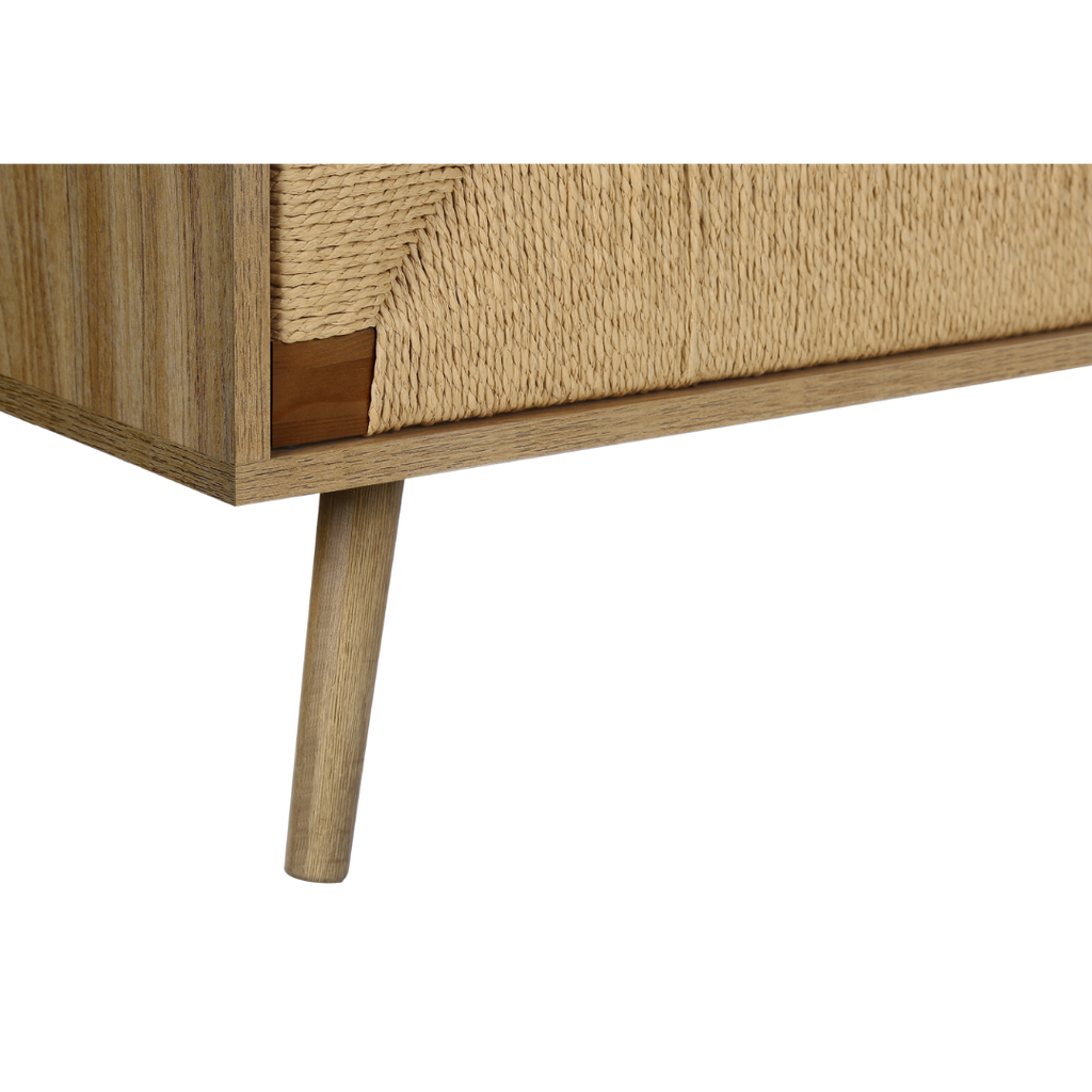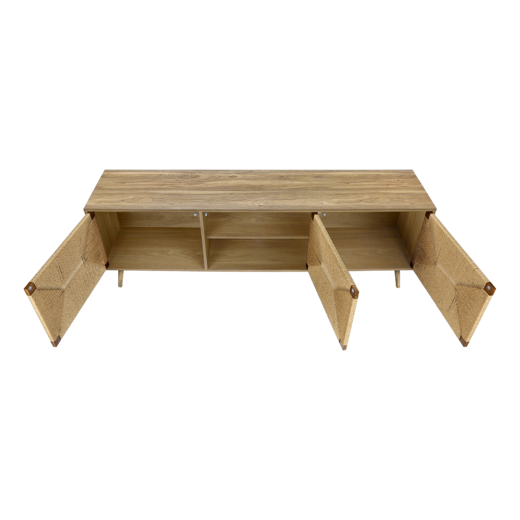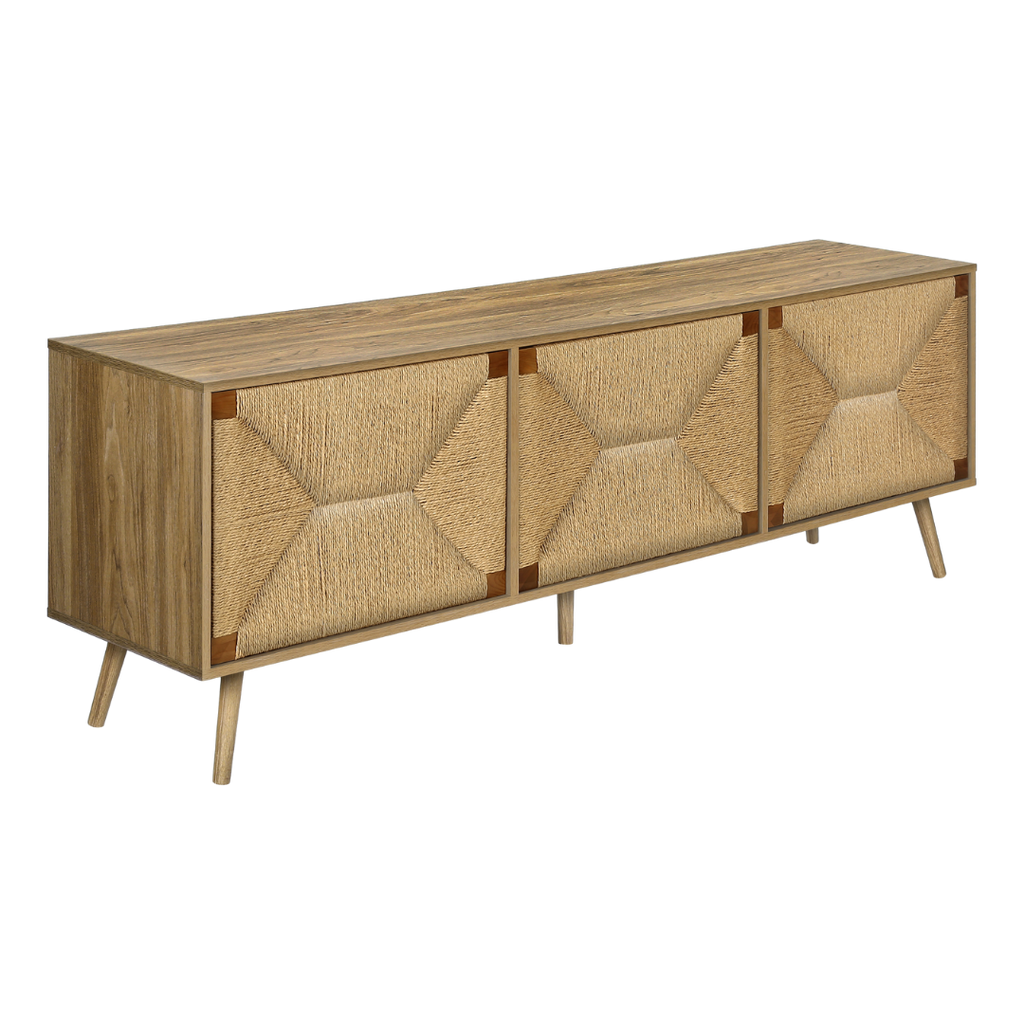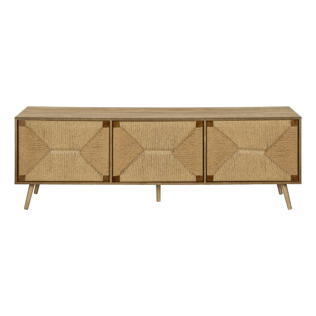 The Merlo TV stand brings warmth, character, and modern function to your living space. Its light walnut finish pairs beautifully with the geometric seagrass-look doors, creating a natural, airy aesthetic.