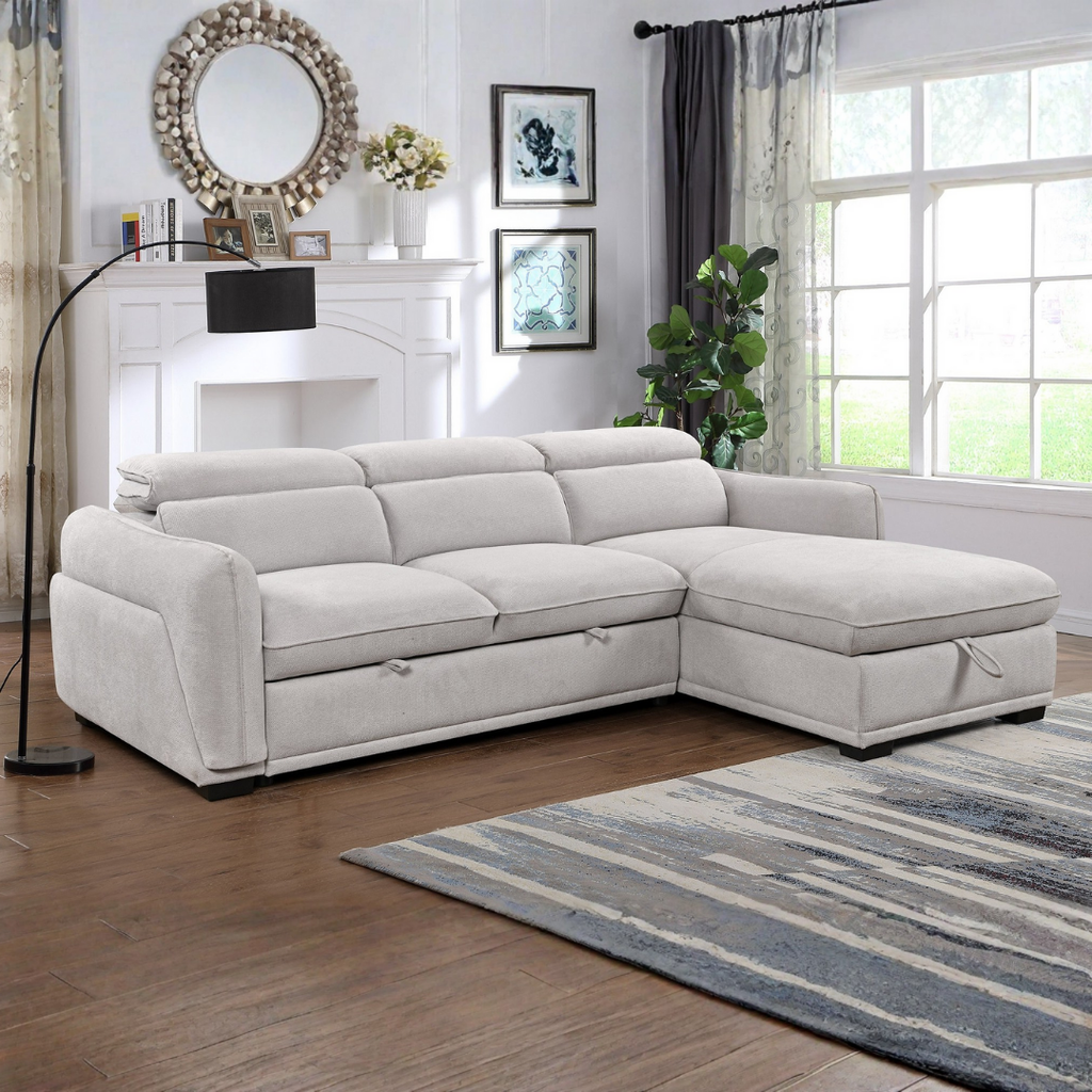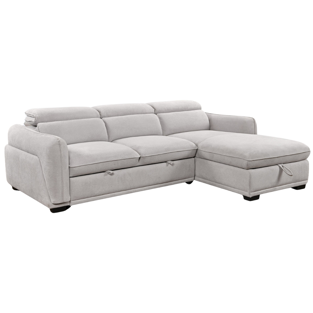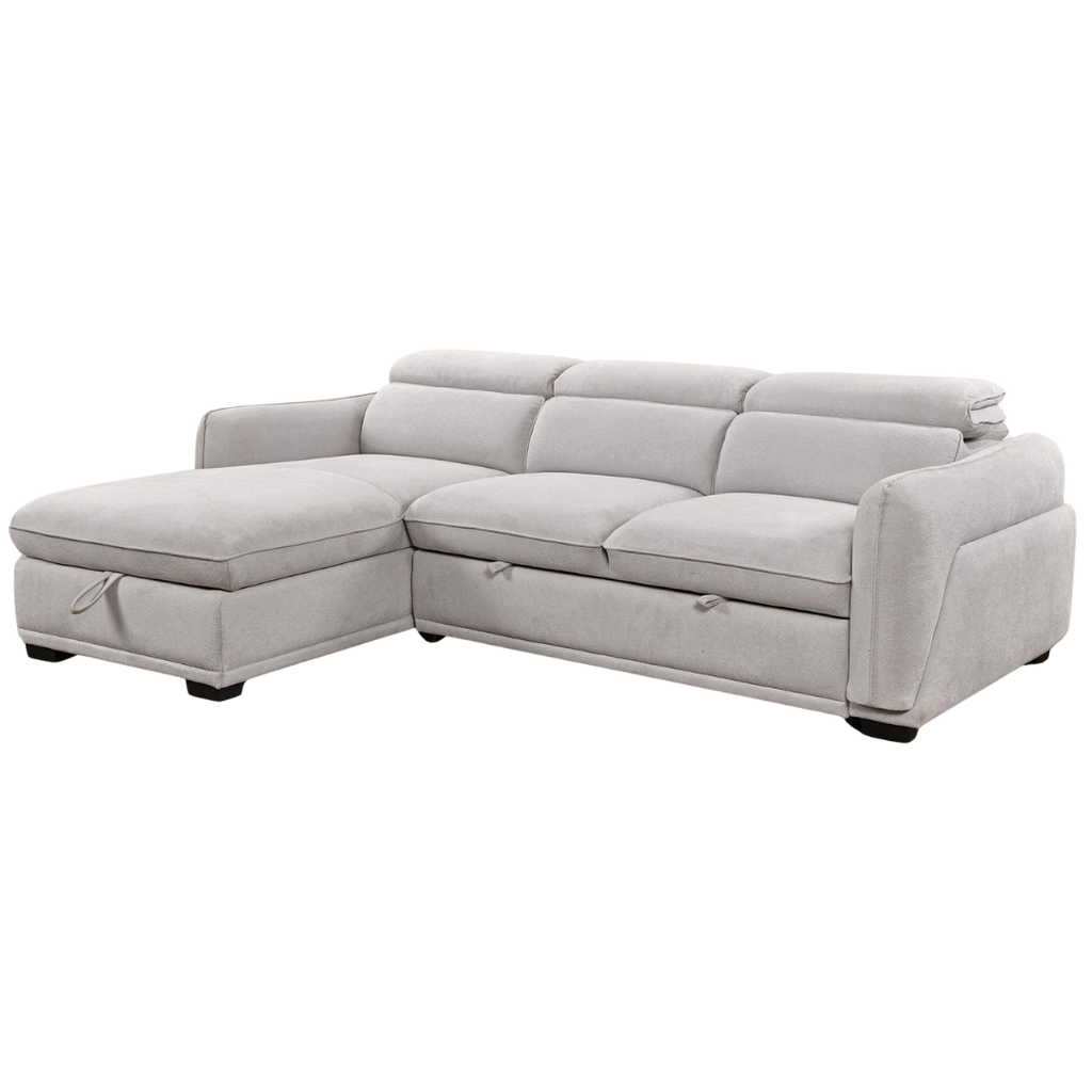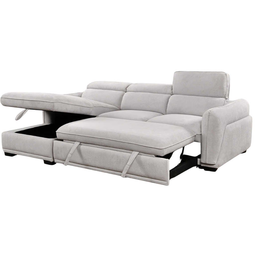 A modern light-grey sofa bed sectional with adjustable headrests, a smooth pull-out sleeper, and a large lift-up storage chaise. Available in left- or right-hand facing configurations to fit any living space.